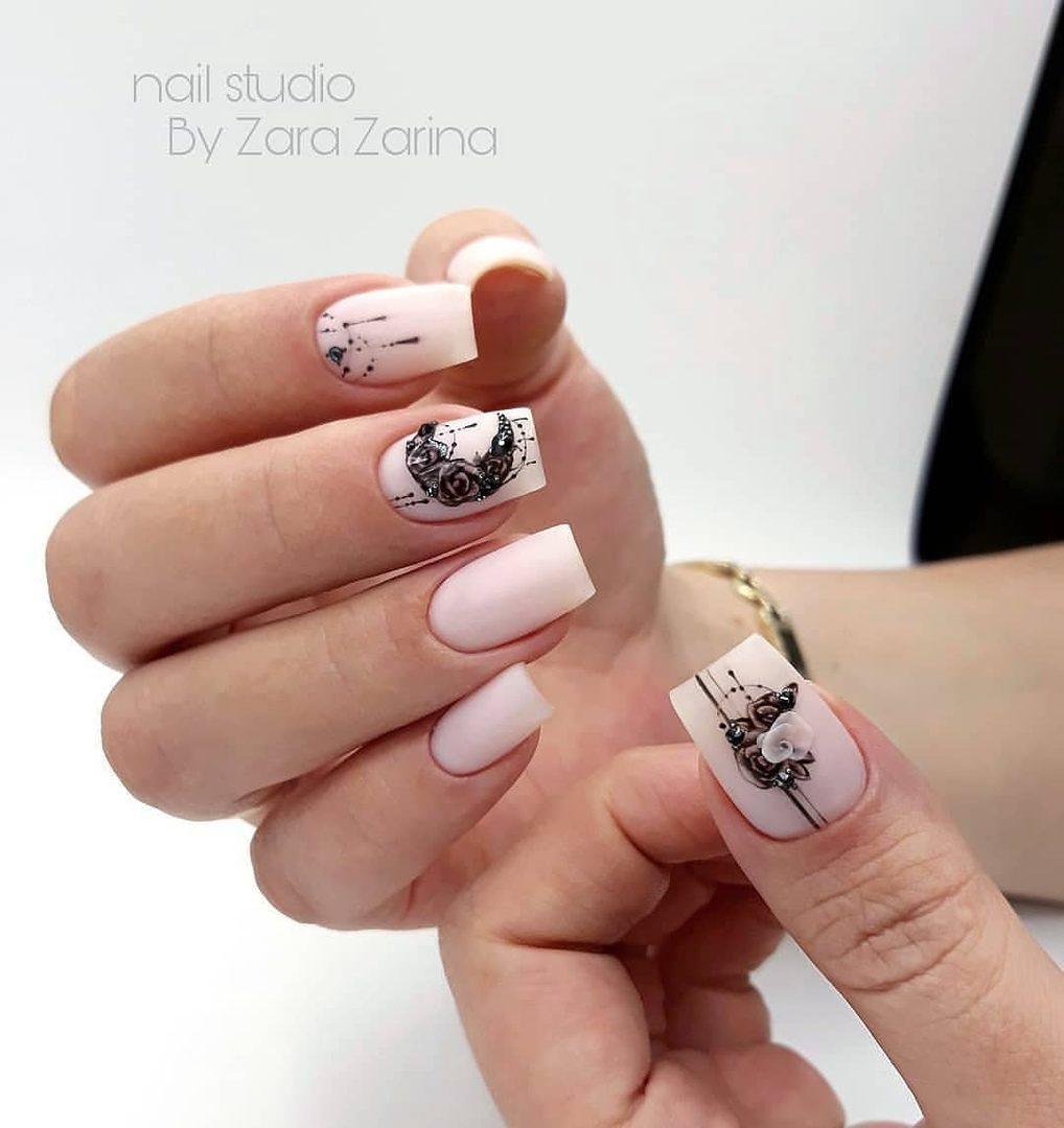 Среди актуальных видов дизайна также стоит отметить негативное пространство. Столь сдержанное оформление смотрится невероятно красиво. Особенно в сочетании с другими техниками и рисунками. Цветы и геометрические детали часто используют именно в таком оформлении. Декоративные блестки добавляют маникюру яркости, тем самым демонстрируют его несколько иначе.