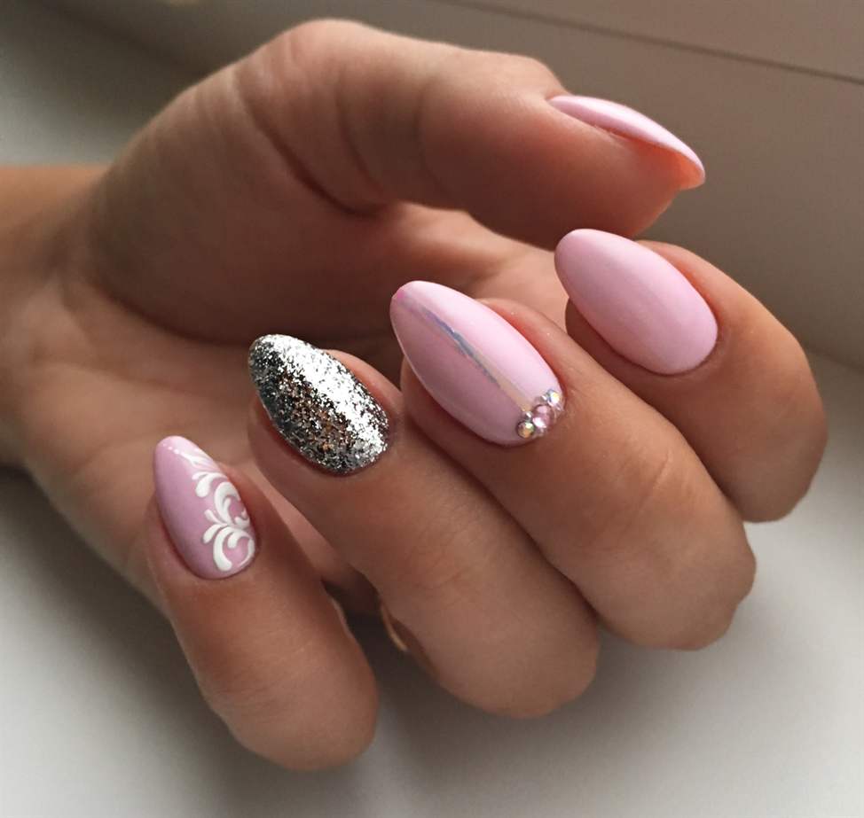 Модный маникюр металик в розовом исполнении, и в сочетании с серебренными блестками выглядит очень стильно и ярко.