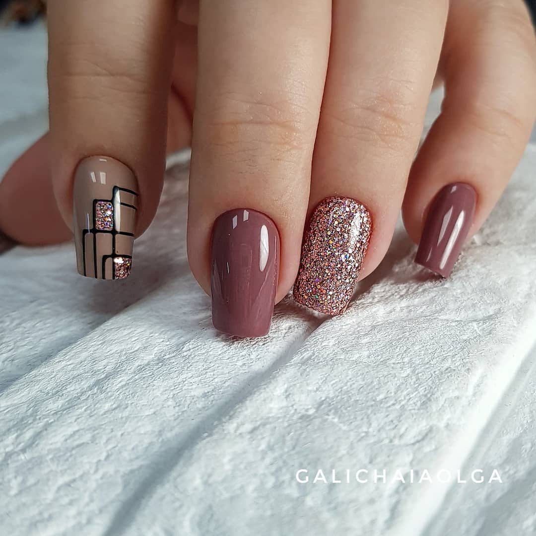 Очень красивое сочетание маникюра геометрия с блестками, и к тому же цветовые переходы интересно обыграны.