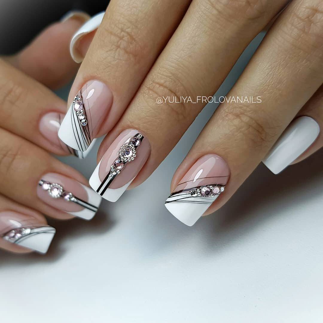 Актуальными в сезоне 2021 станет никогда не выходящий из моды френч, растяжка с блестками, минималистичный дизайн, а также геометрические узоры.