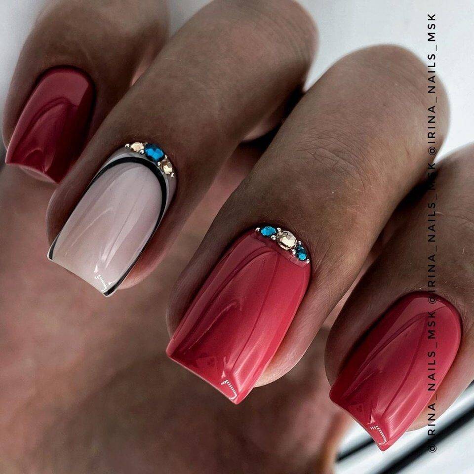 В красно-черном цвете шикарно выглядит градиентный маникюр. Выбирайте для дизайна гель-лаки с блестками, шиммером, глиттером и другими блестящими текстурами. Отлично смотрится соседство красного матового гель-лака и черного гель-лака с пайетками. Стоит учитывать, что оба цвета выглядят достаточно насыщенно и броско, поэтому не рекомендуется нагромождать ноготки геометрией, абстракцией, флористикой и другим декором. Оптимальный выбор – это однотонный маникюр с блестящим акцентом на 1-2 ноготках. Даже в торжественных образах такой маникюр будет смотреться уместно и сдержанно.