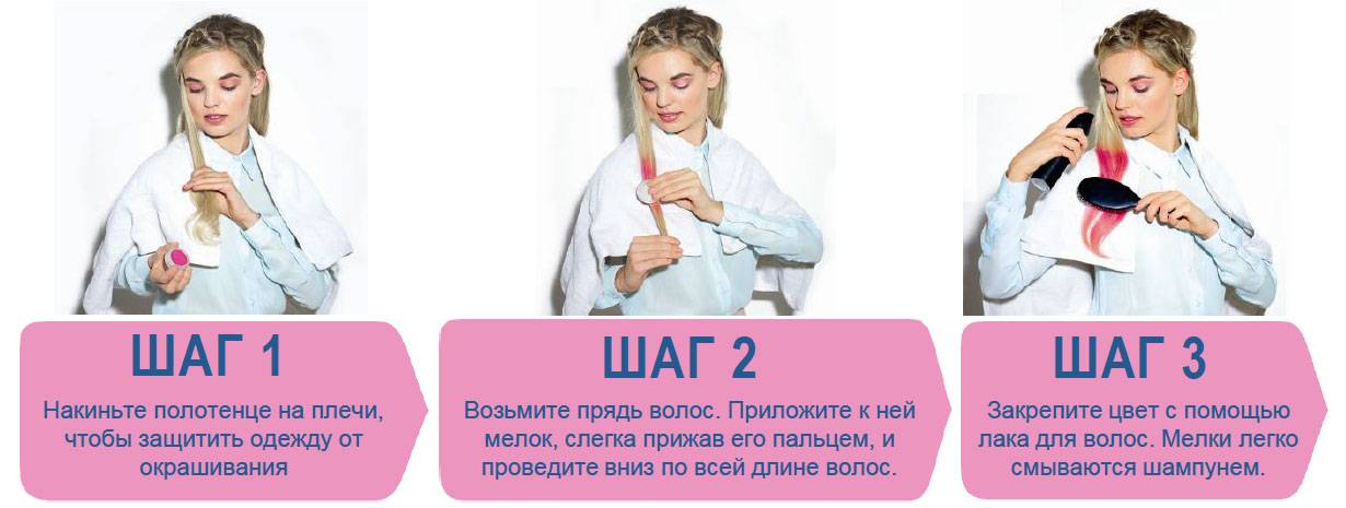 Мелки помогают создать кратковременный, но ультрамодный и необычный образ. Можно без опасений покрасить волосы в самый «кислотный» цвет для похода в ночной клуб, сделать на голове всплеск нескольких десятков тонов и создать кукольный образ для участия в театральном выставлении или, например, сделать волосы флагом команды, за которую вы пришли поболеть на футбольном поле. Количество вариантов для перевоплощения множество, поэтому экспериментируйте и будьте оригинальны.