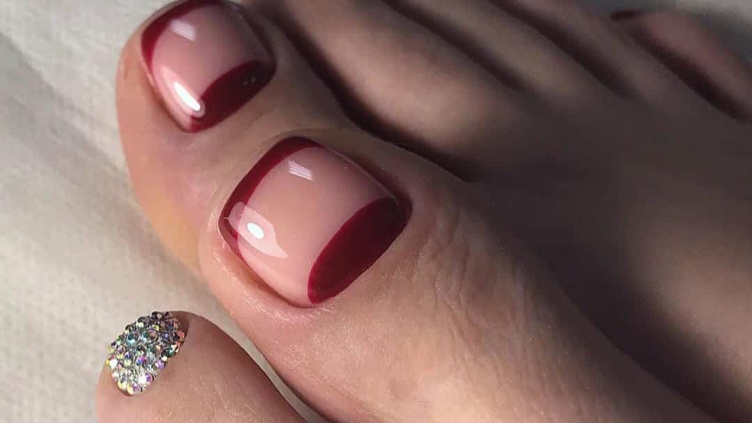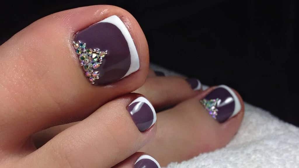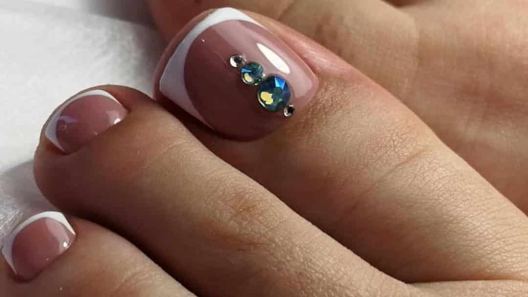 разновидностям французского педикюра с дополнениями в виде маленьких камней;