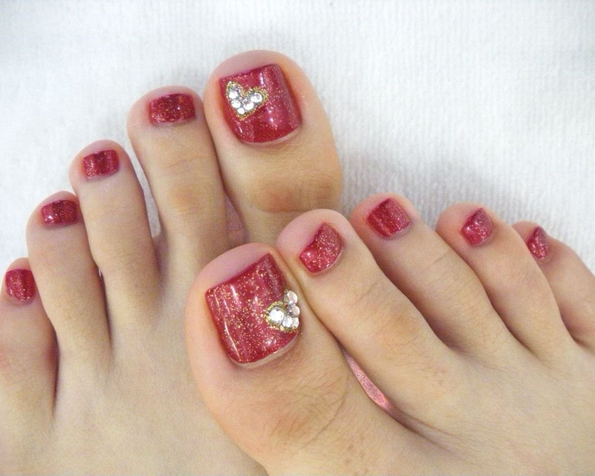 Невероятно популярный дизайн, где стразы играют главную роль. Из них выкладывают узоры и цветы по всех поверхности ногтевой пластины. Помимо сверкающих камушек такой педикюр дополняют блестками и декоративным покрытием в нескольких оттенках.