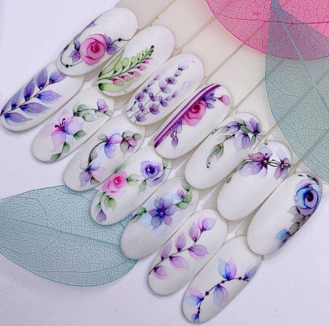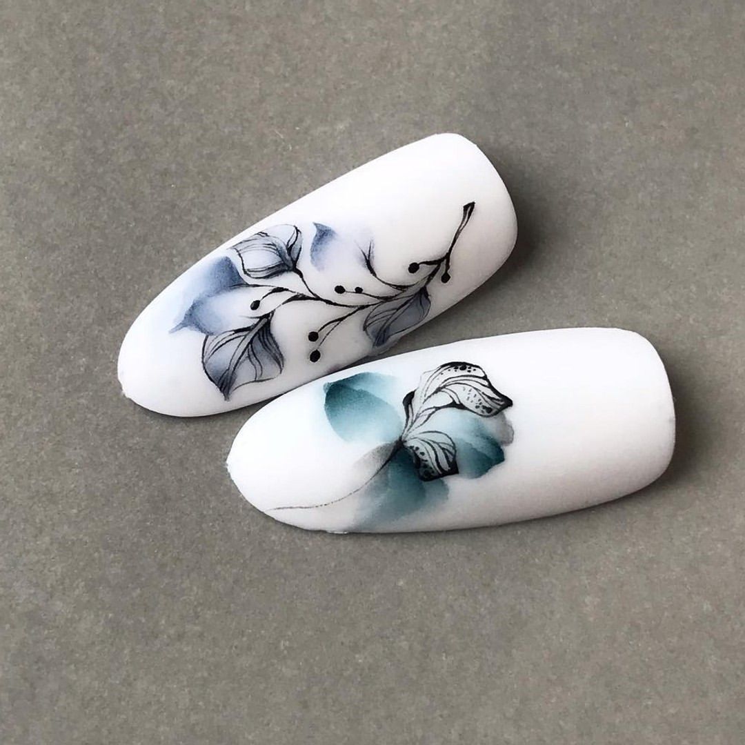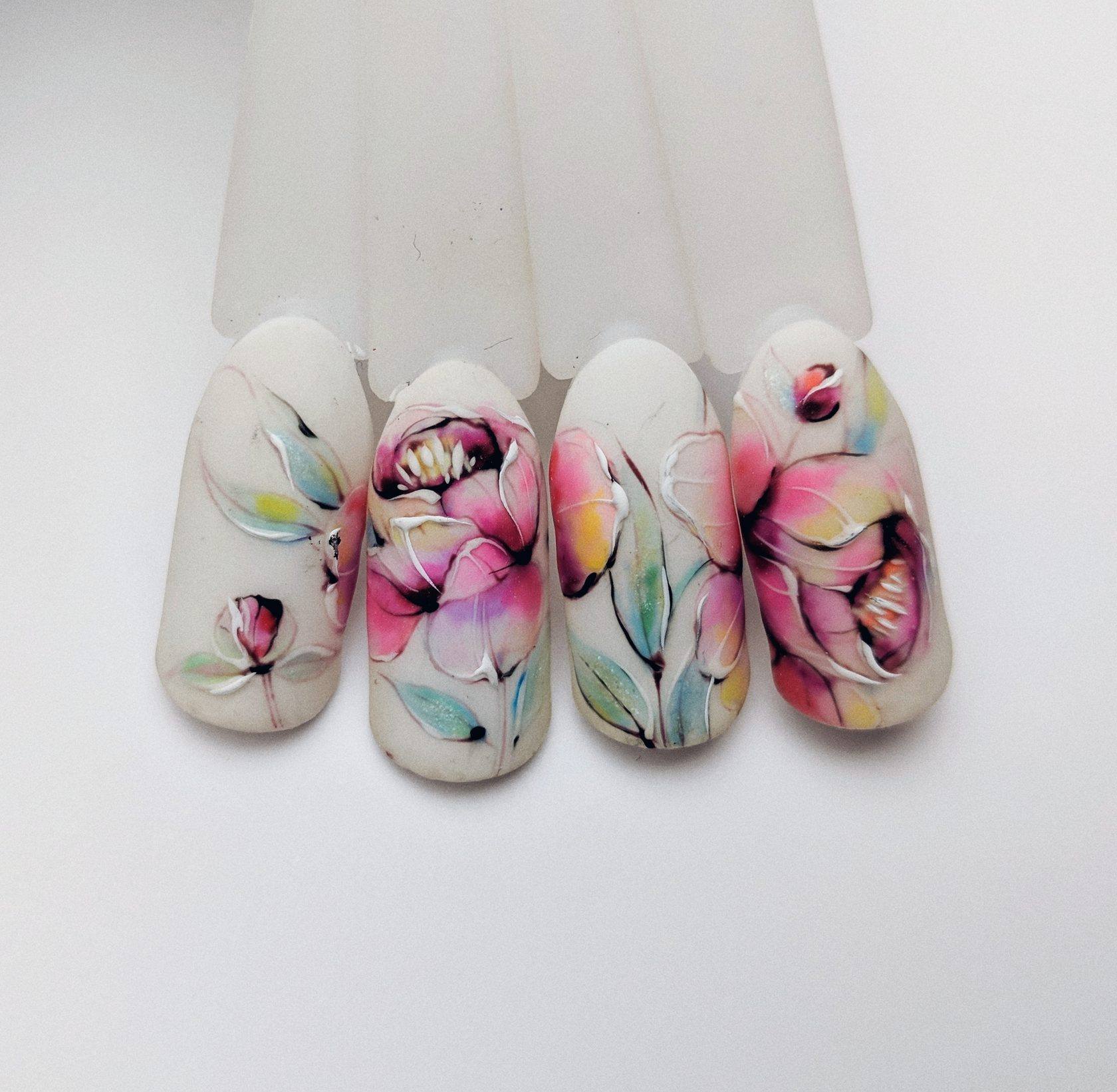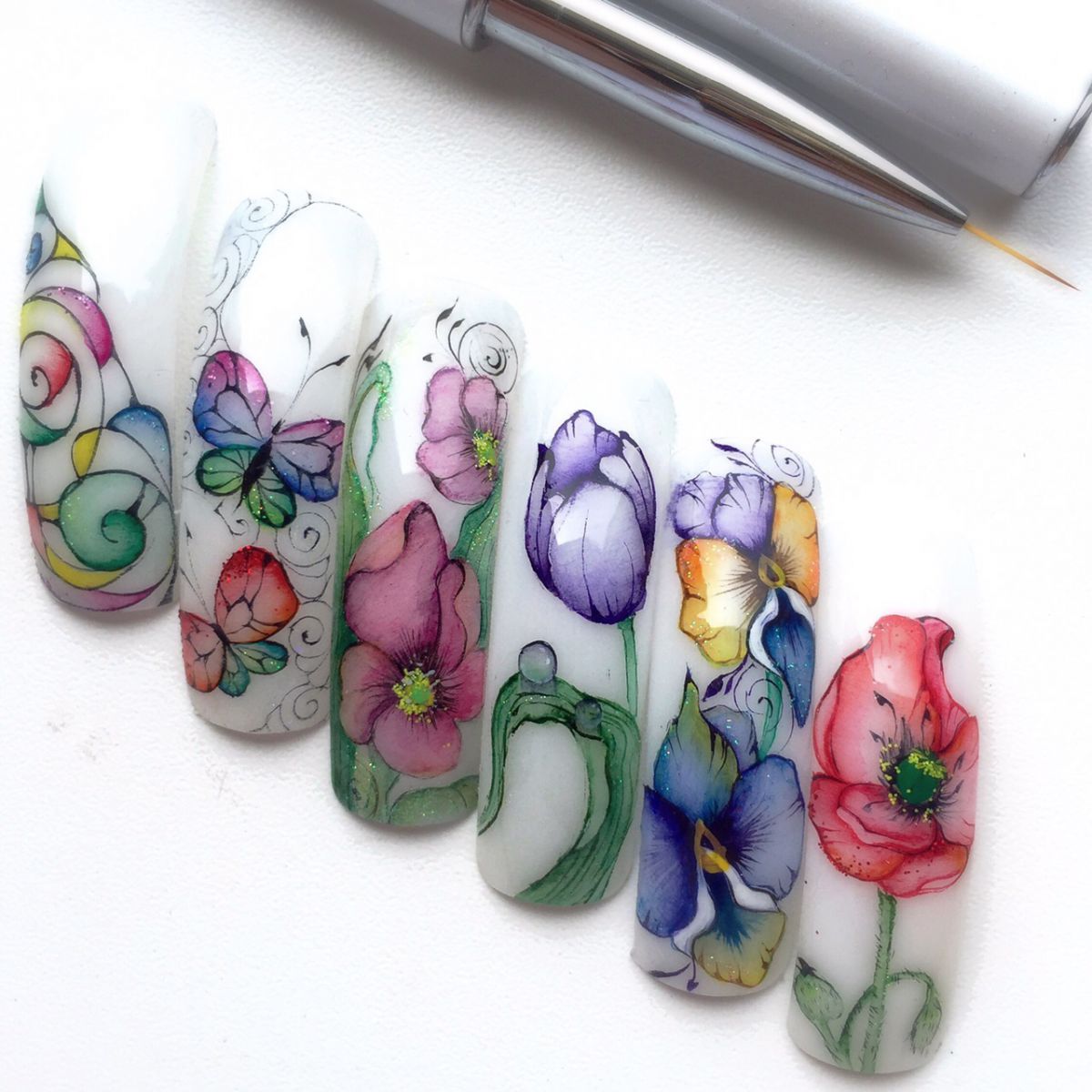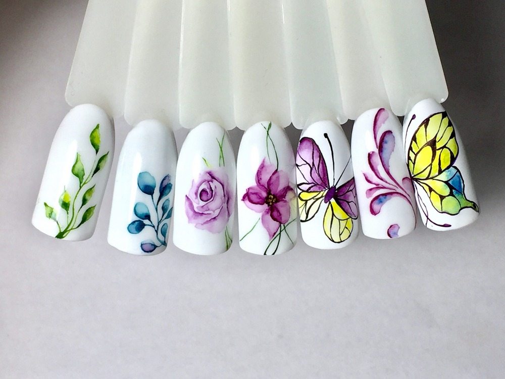Акварельная роспись, в отличие от многих техник нейл-арта, требует от мастера художественных навыков, так как каждый элемент рисунка создается вручную с помощью кисти, но при этом дает практически неограниченные возможности для оригинального дизайна.
