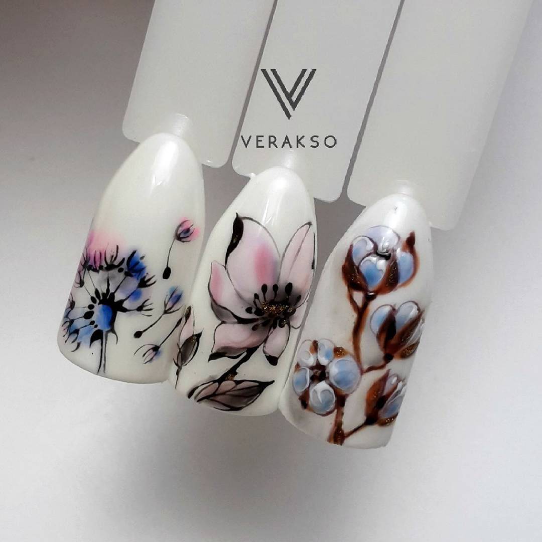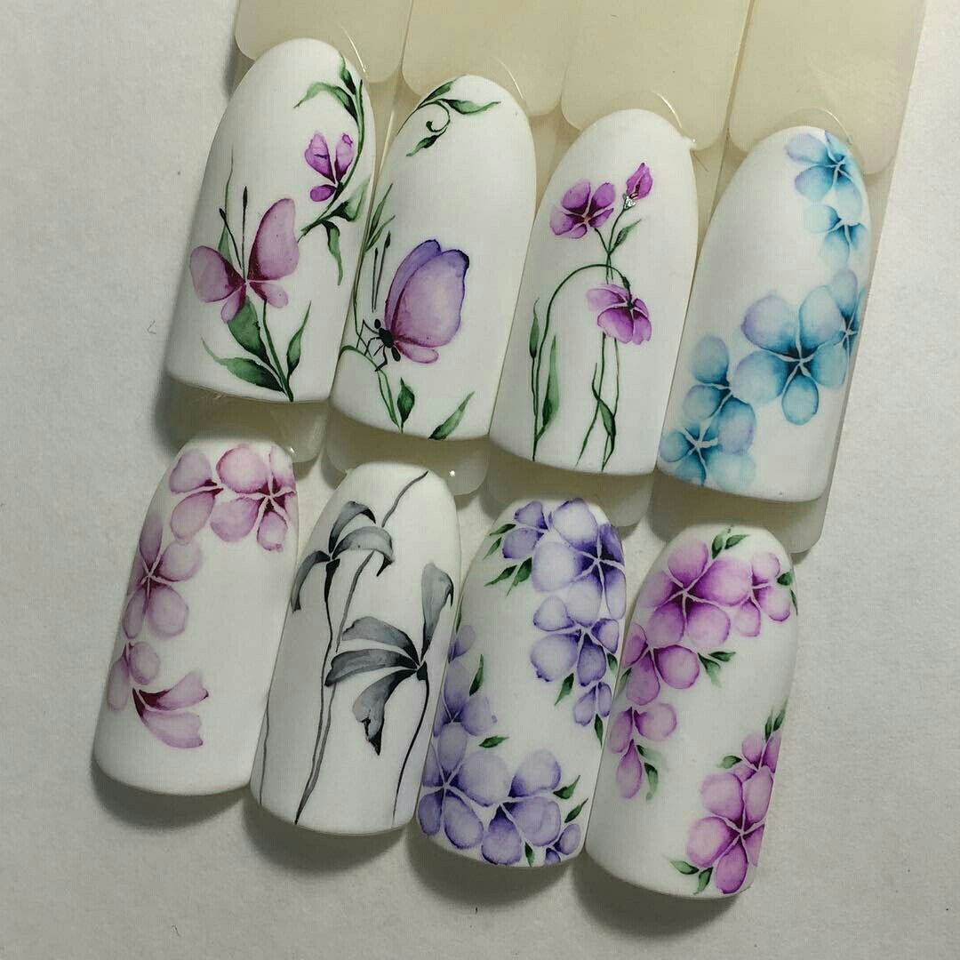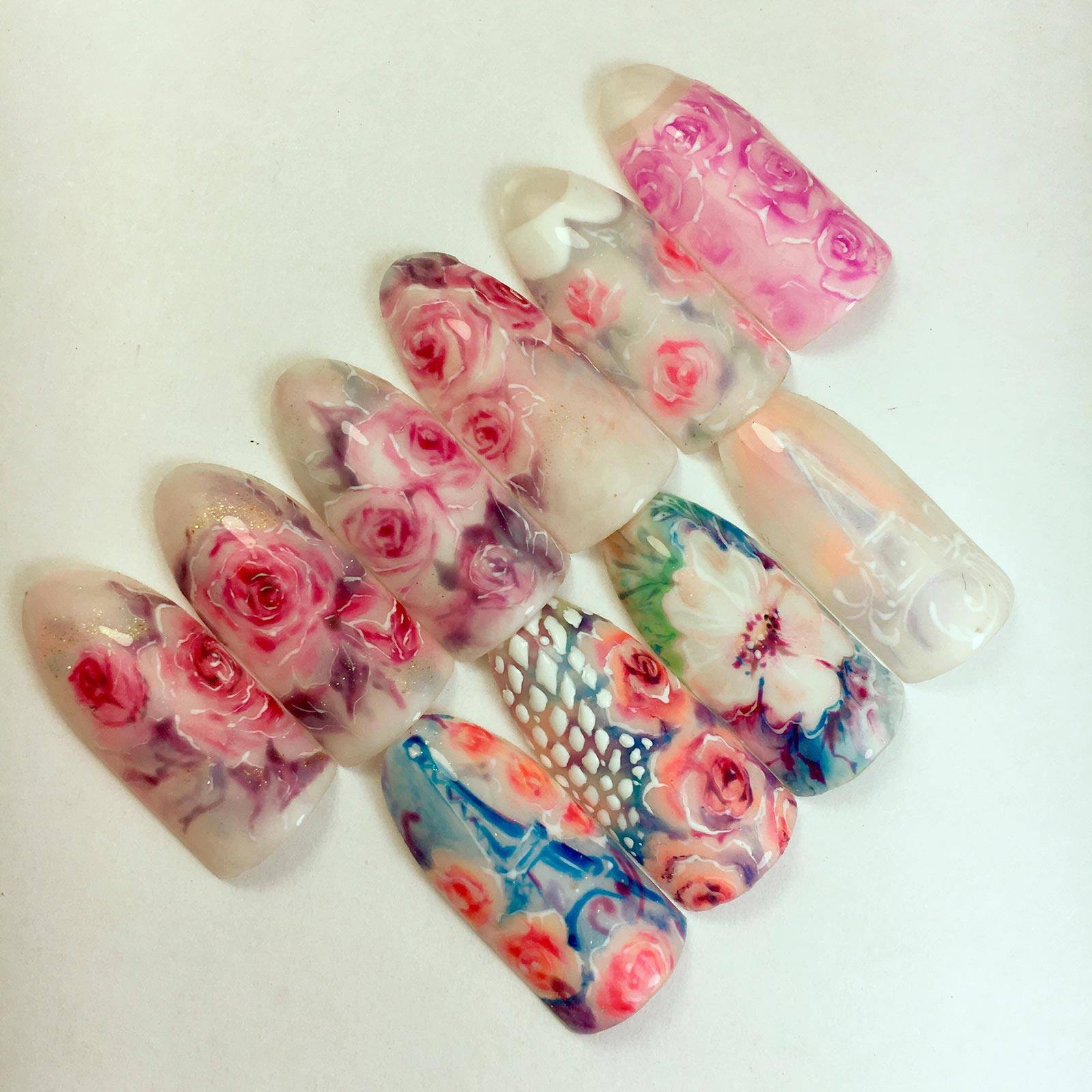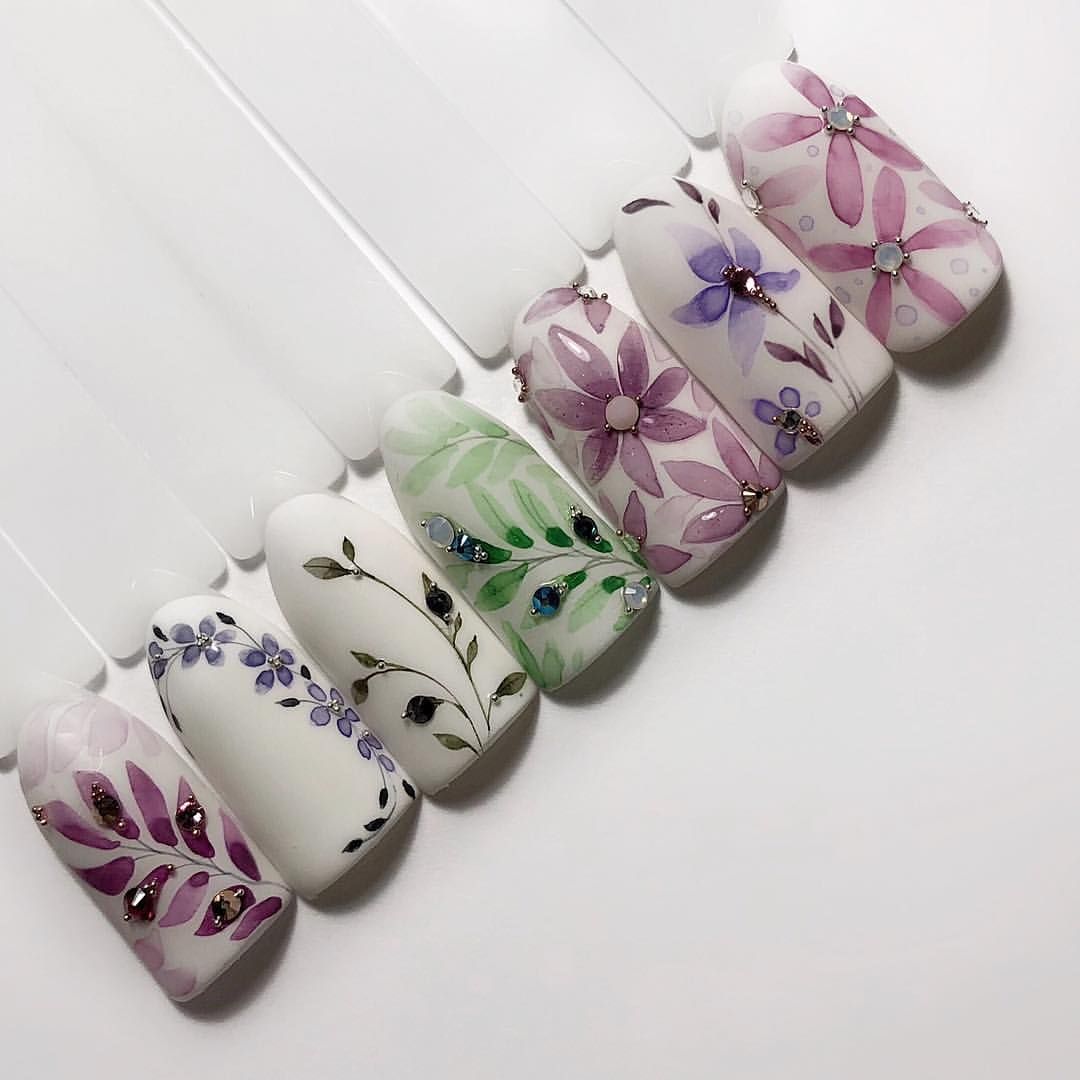 Акварельная роспись, в отличие от многих техник нейл-арта, требует от мастера художественных навыков, так как каждый элемент рисунка создается вручную с помощью кисти, но при этом дает практически неограниченные возможности для оригинального дизайна.