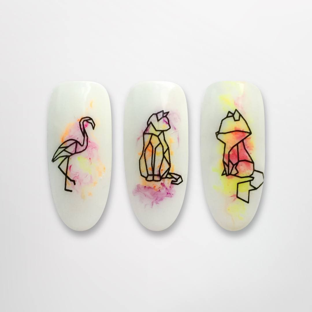 Разводы отлично смотрятся в дизайне с геометрией. Для этого выполняйте окантовку узора с разводами прямыми тонкими линиями, треугольниками. Выполняйте узор с разводами внутри ромбов и треугольников. В качестве цвета для окантовки можно использовать черный или белый гель-лак.