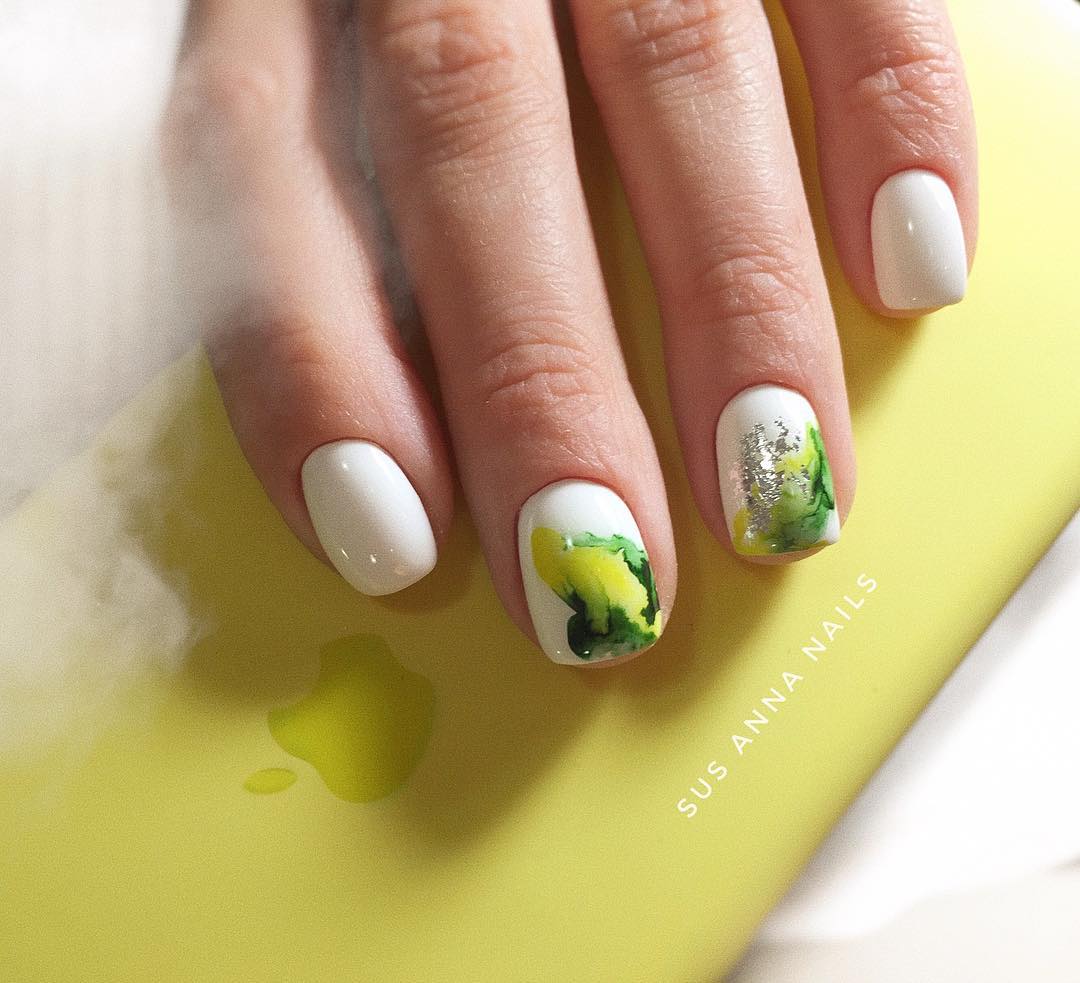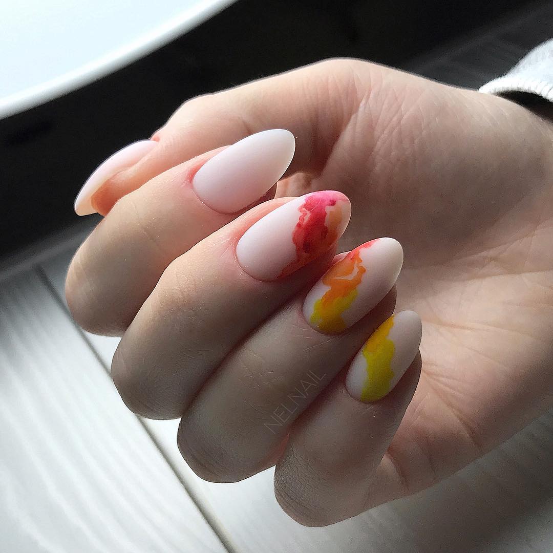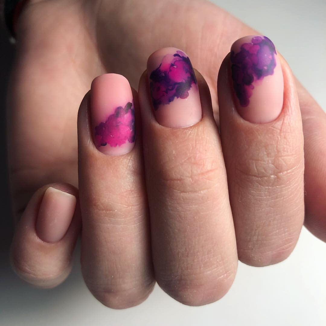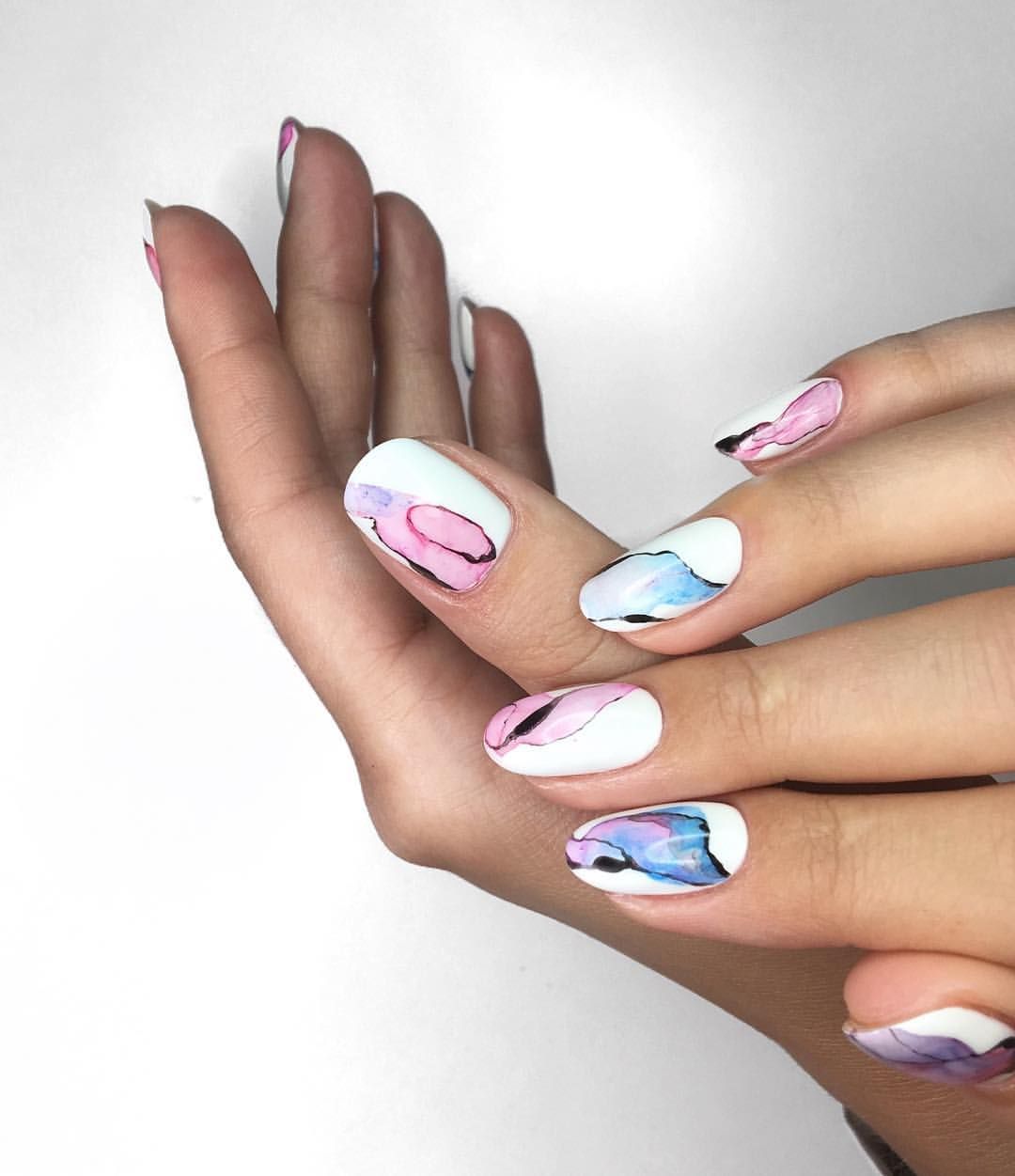 Популярностью пользуется и акварель. Как сделать акварельные разводы на ногтях? Для этого вам понадобятся акварельные краски, капли либо акварельный гель-лак. Можно также сделать акварельный дизайн, используя маркерную технику.Акварельные разводы на ногтях
