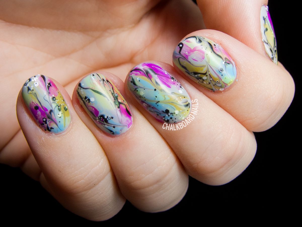 Маникюр с разводами гель-лакомСтоит отметить, что способов выполнения водного маникюра существует несколько. Вышеописанный – самый легкий и экономичный, да и кожа вокруг ногтей в этом случае останется чистой.