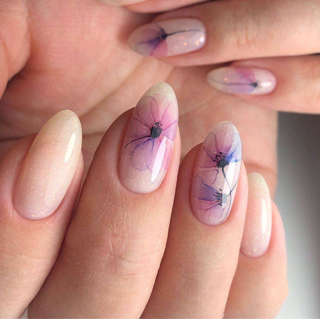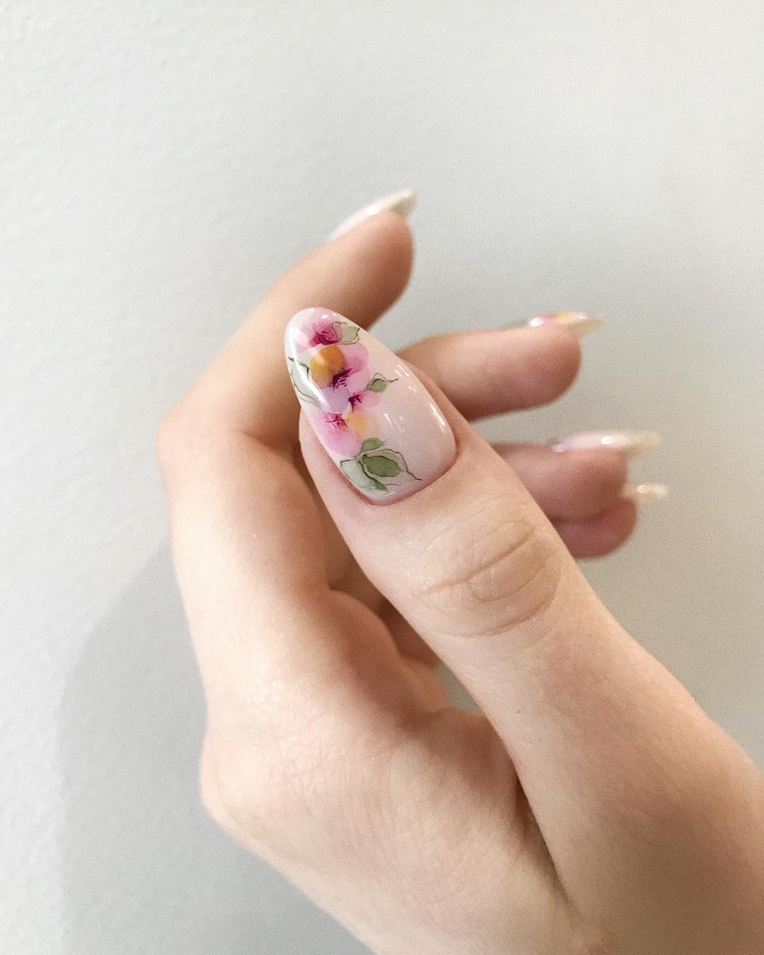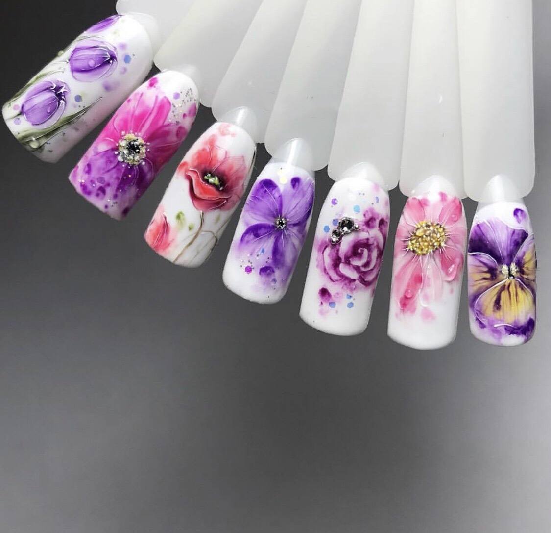 Уже многие годы цветочный рисунок – едва ли не самый популярный вид дизайна для ногтей. Его используют в качестве украшения френча, однотонного покрытия и многих других вариантов оформления. Поэтому не удивительно, что цветы все чаще наносят в акварельной технике. Это позволяет смешивать оттенки в желанных пропорциях, чтобы добиться подходящих тонов. Примечательно, что данная техника не предполагает многослойного нанесения красок. Поскольку главное – тщательно их наносить, не допуская проплешин.