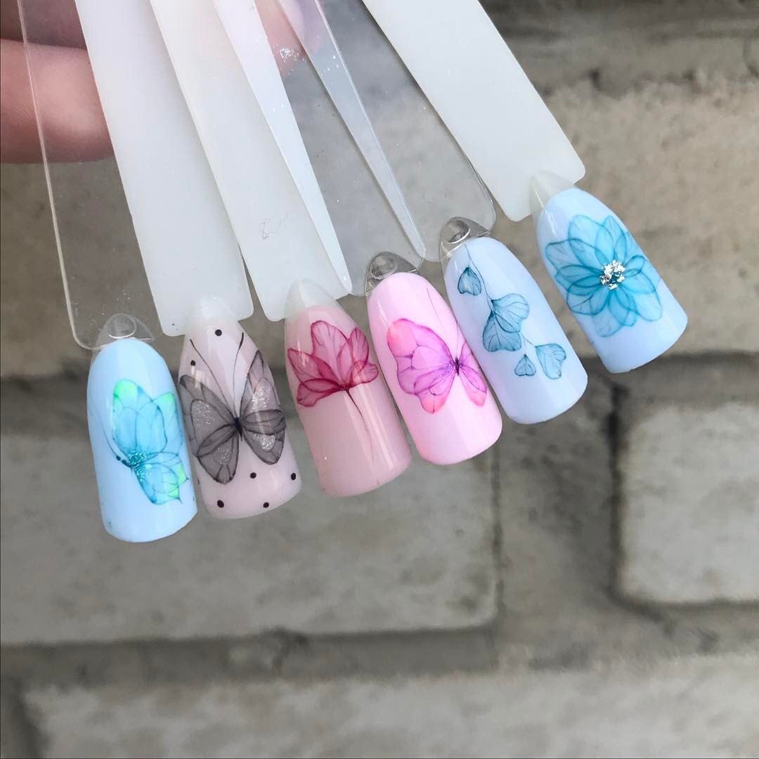 Если данная техника нанесения кажется вам слишком сложной, существуют и альтернативные решения. В первую очередь речь идет о готовых картинках, которые представлены, как слайдер-дизайн или наклейки. Благодаря им можно нанести дизайн симметрично или же выбрать определенную его часть. Кроме того, наклейки часто используют для оформления лунного маникюра в акварельной технике. Буквально несколько страз или блесток и оформление будет выглядеть невероятно красиво.