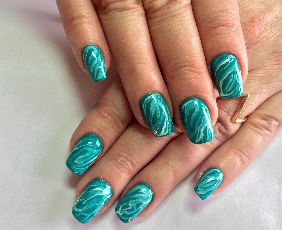 Зато, сэкономив время на создание мраморного эффекта, можно потрудиться над нейл дизайном. Например, добавить ногтям изюминки: приклеить скотч-ленту, сделать литье, добавить стразы, камни, бульонки, совместить несколько видов маникюра.