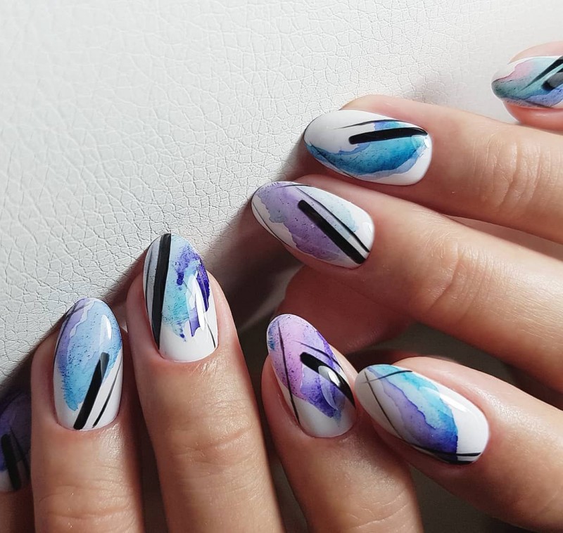 Популярностью пользуется и акварель. Как сделать акварельные разводы на ногтях? Для этого вам понадобятся акварельные краски, капли либо акварельный гель-лак. Можно также сделать акварельный дизайн, используя маркерную технику.Акварельные разводы на ногтях