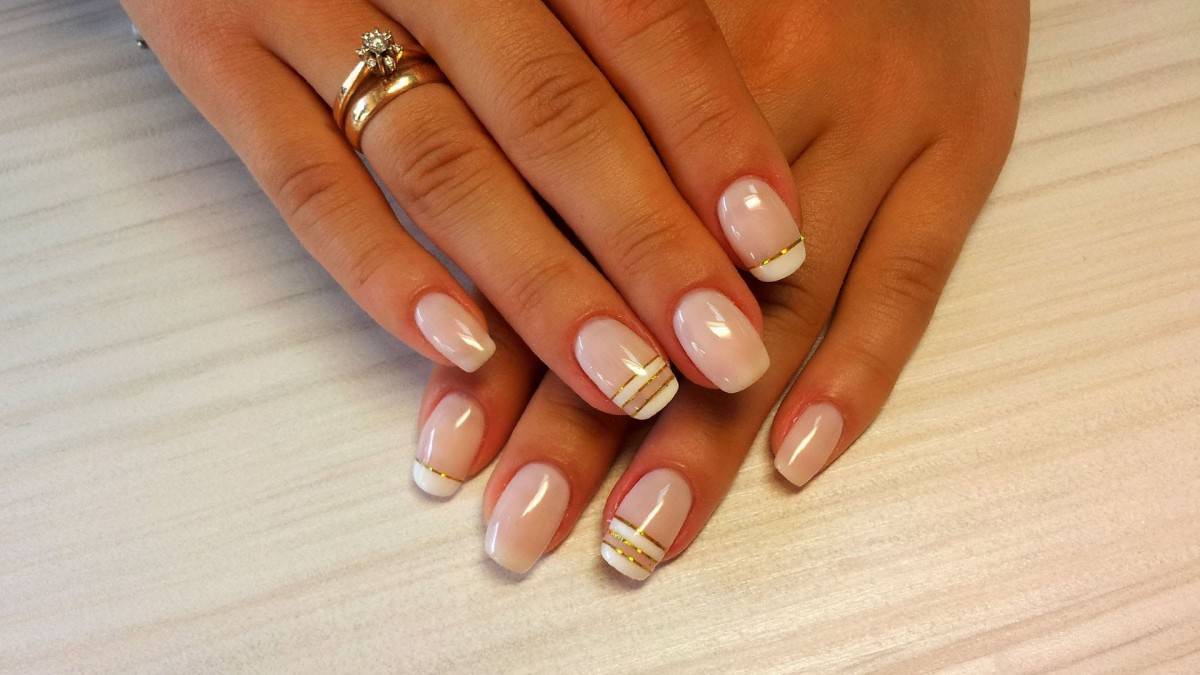 Нанесите на ногти базовый цвет, например, розовый или телесный, и выделите свободный край белым цветом