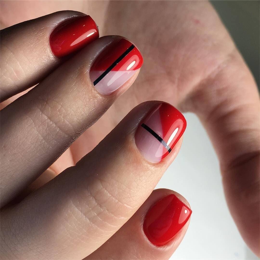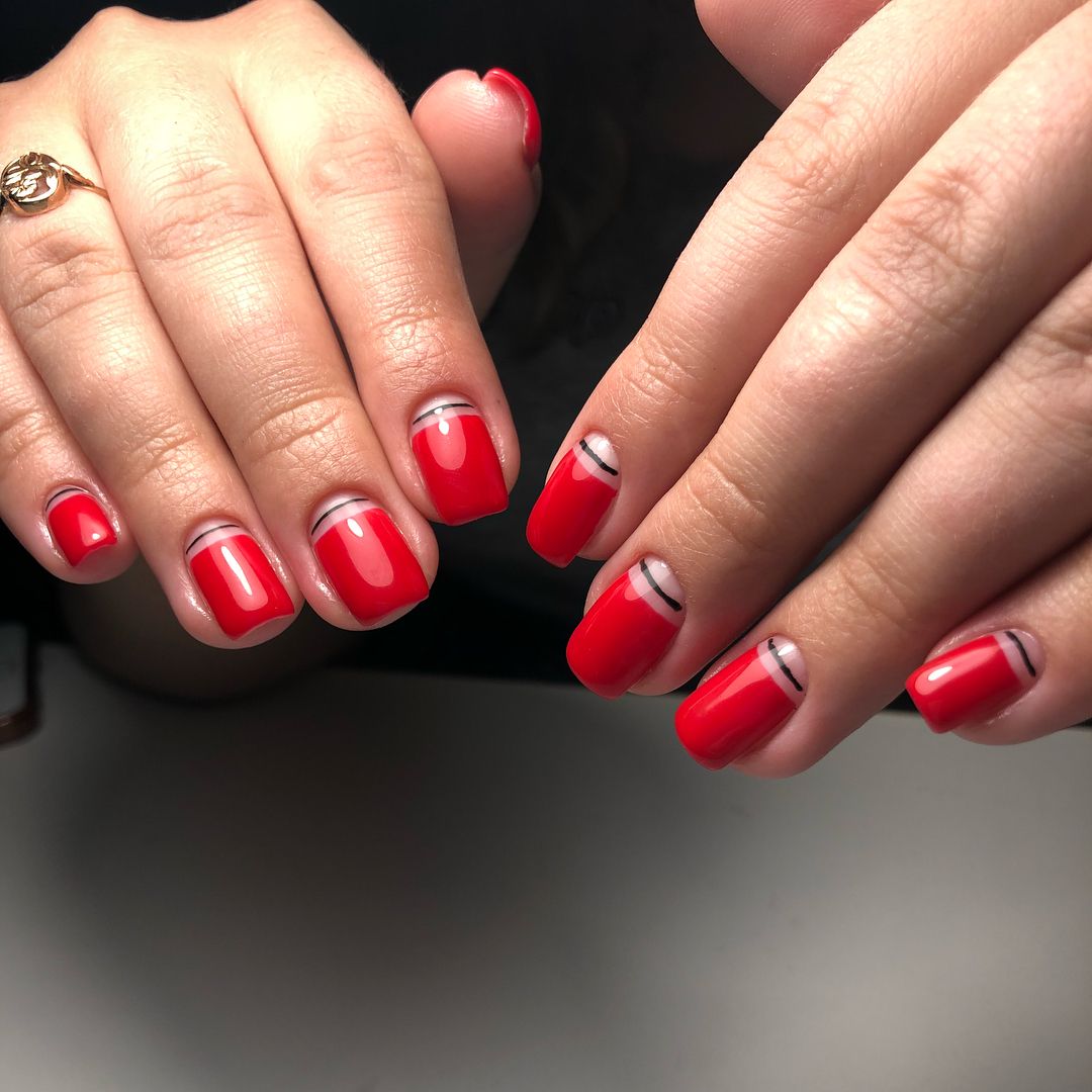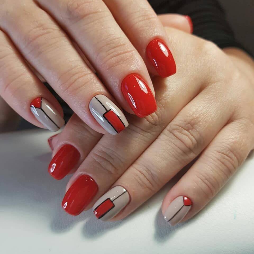 - геометрия – такой сдержанный цвет как красный и его многочисленные оттенки нуждаются в строгих и лаконичных узорах. Геометрия в белом, черном и других оттенках станет лучшим дополнением алого, бордового, вишневого маникюра.
