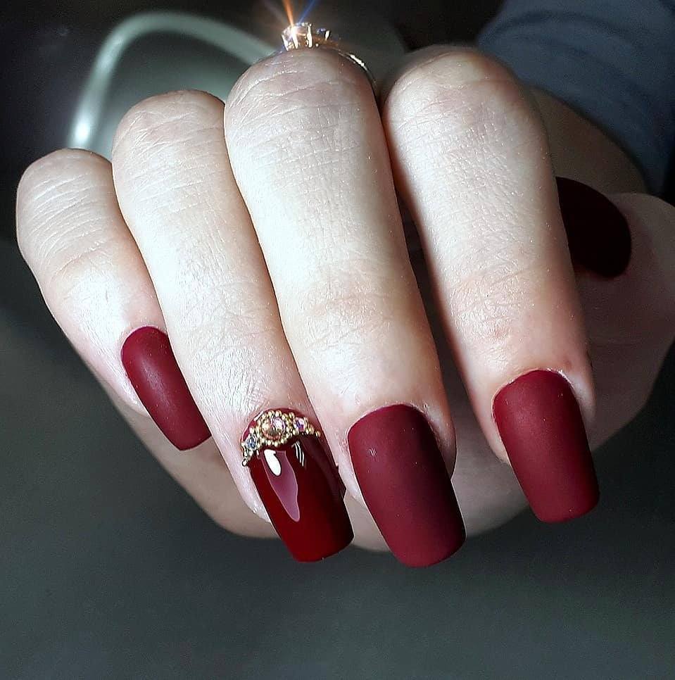 Чтобы маникюр был более естественным и стильным, темно-красный фон рекомендуется матировать.
