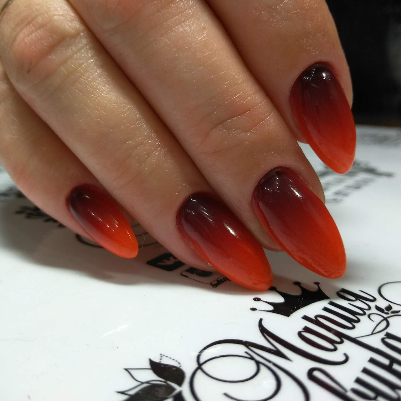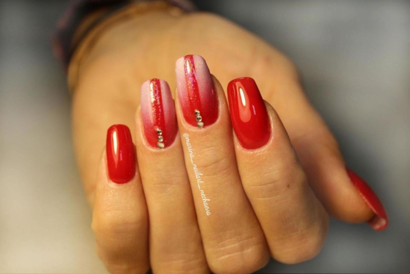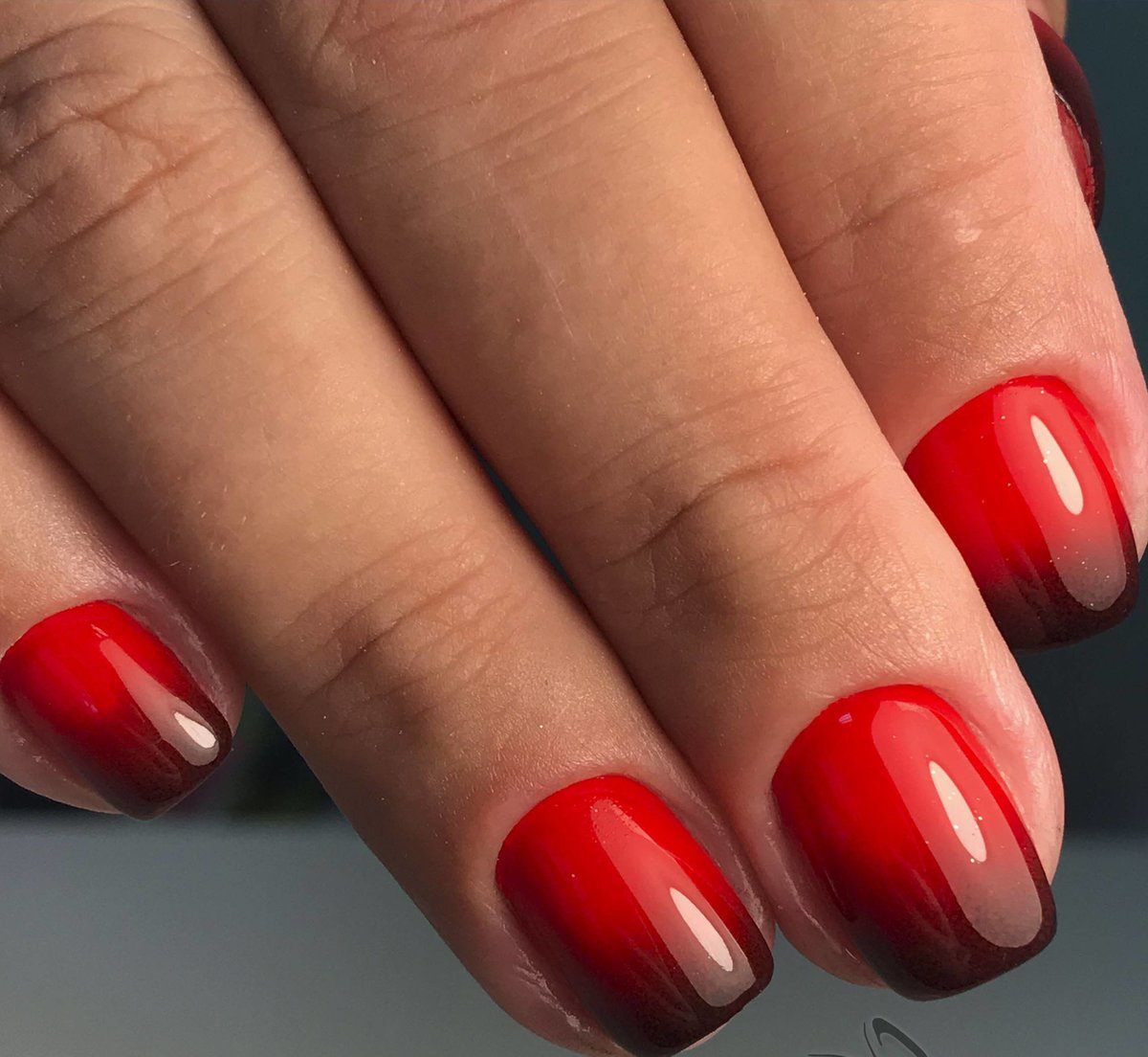 Также красный цвет нередко используют в качестве основы для градиентного дизайна. Плавный переход оттенков от красного к черному тону – стильное решение для самых смелых модниц. Дополнительным украшением такого маникюра часто являются стразы, блестки или небольшое количество пигмента.