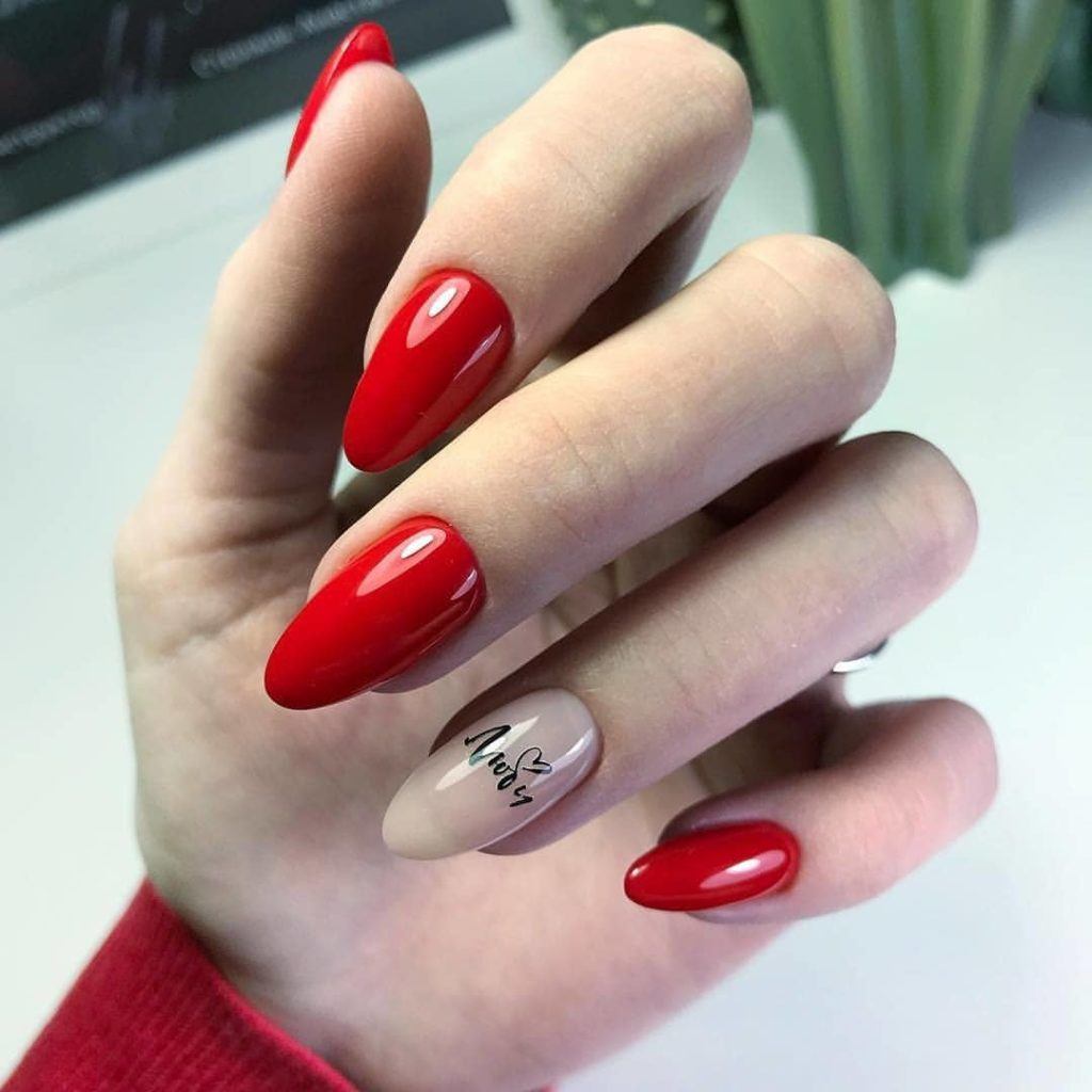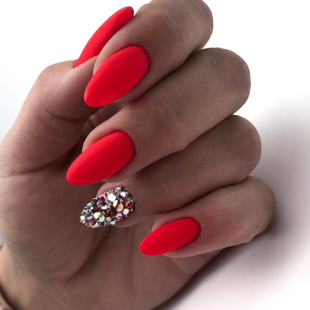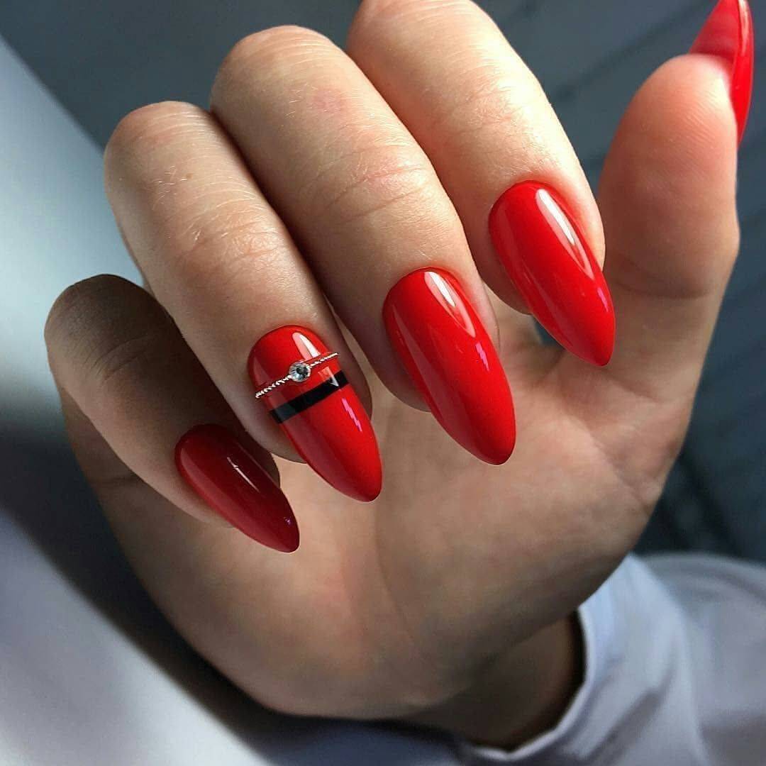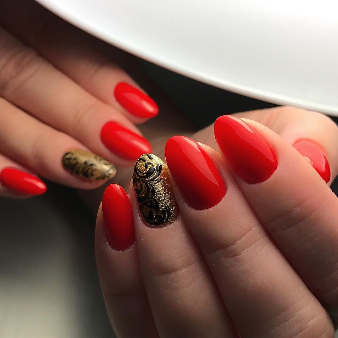 Красные миндалевидные ногти – это сочетание элегантности и женственности. Такой тандем без сомнений можно назвать классическим. На данную форму подходит любой оттенок огненного. В теплое время года желательно использовать гель-лаки светлой гаммы, а в холодное — потемнее. Подборка дизайна и декоративных украшений всецело зависит от образа, которого вы придерживаетесь.