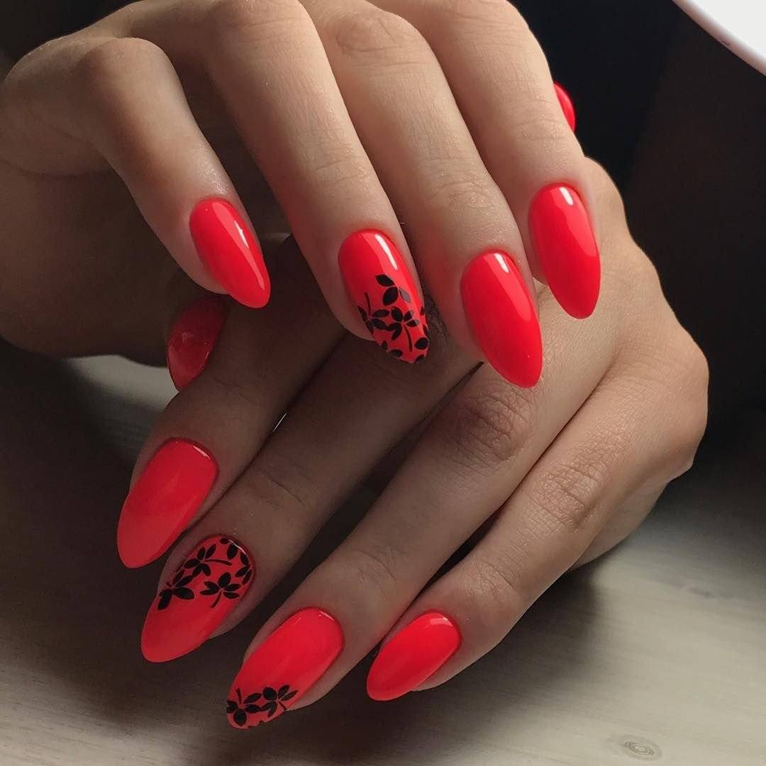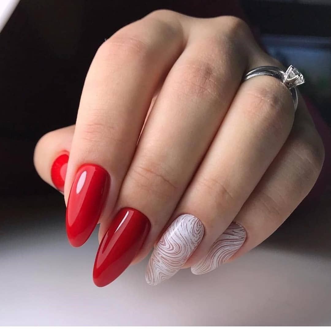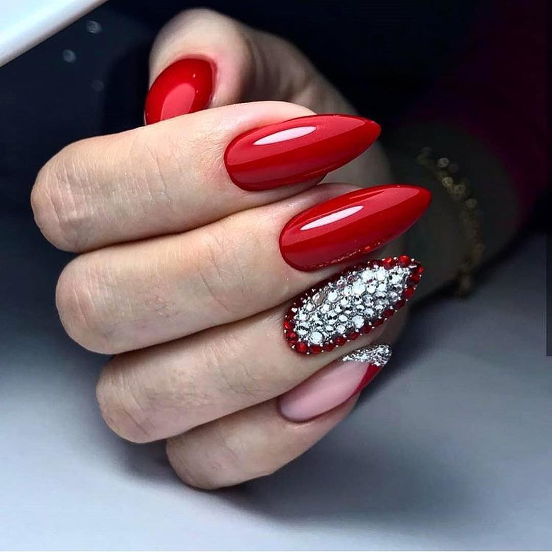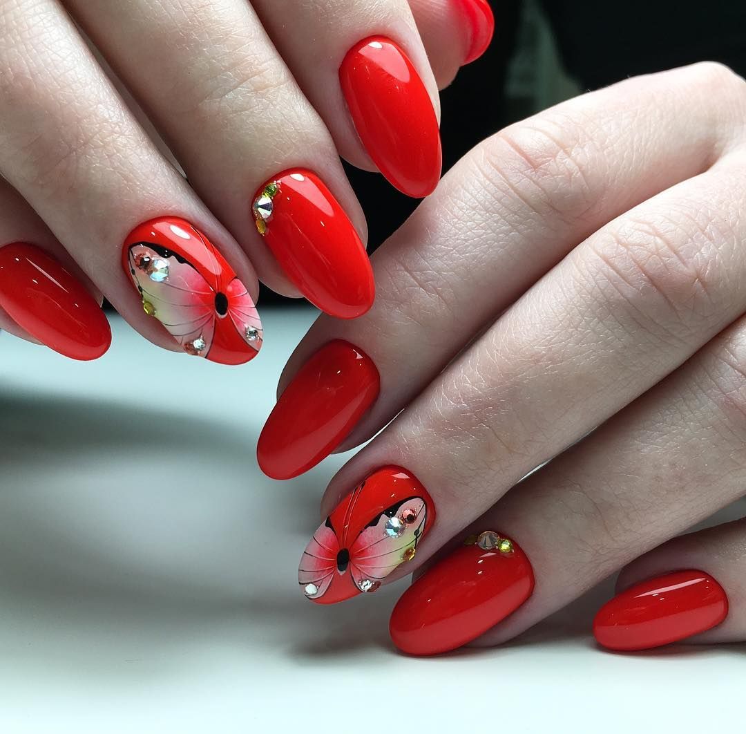 Красные миндалевидные ногти – это сочетание элегантности и женственности. Такой тандем без сомнений можно назвать классическим. На данную форму подходит любой оттенок огненного. В теплое время года желательно использовать гель-лаки светлой гаммы, а в холодное — потемнее. Подборка дизайна и декоративных украшений всецело зависит от образа, которого вы придерживаетесь.