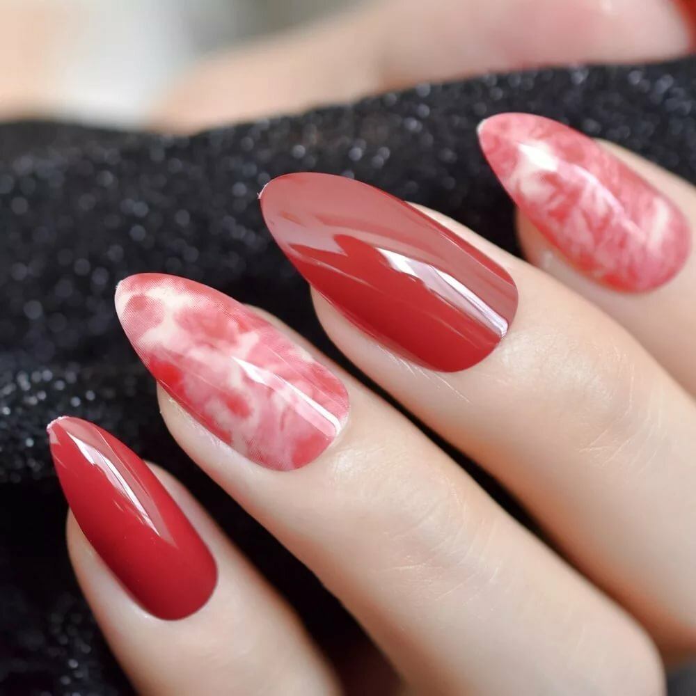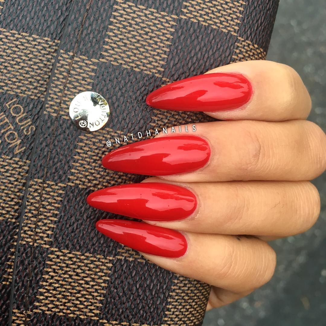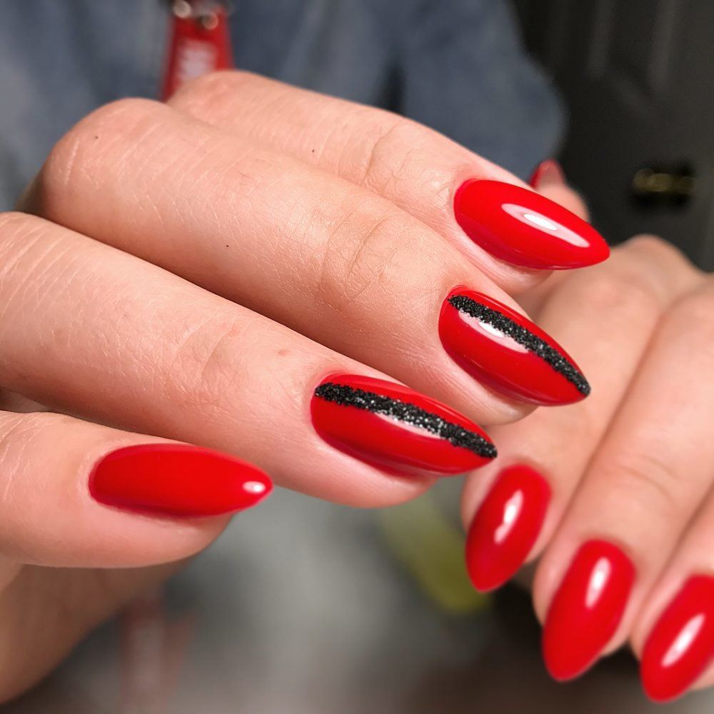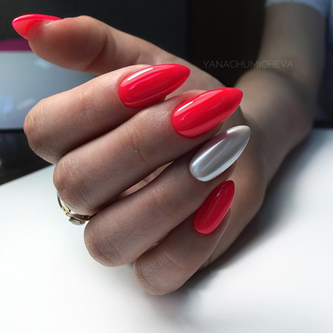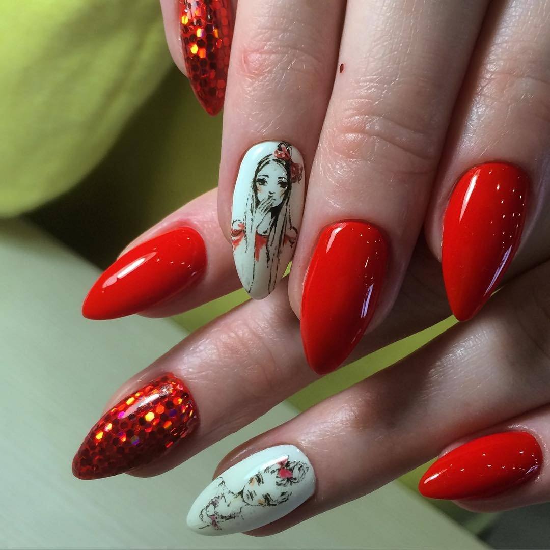 Красные миндалевидные ногти – это сочетание элегантности и женственности. Такой тандем без сомнений можно назвать классическим. На данную форму подходит любой оттенок огненного. В теплое время года желательно использовать гель-лаки светлой гаммы, а в холодное — потемнее. Подборка дизайна и декоративных украшений всецело зависит от образа, которого вы придерживаетесь.