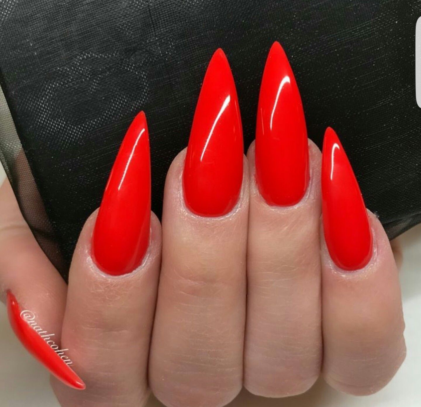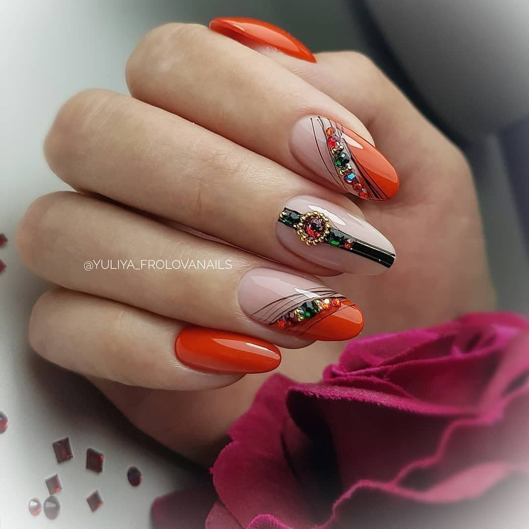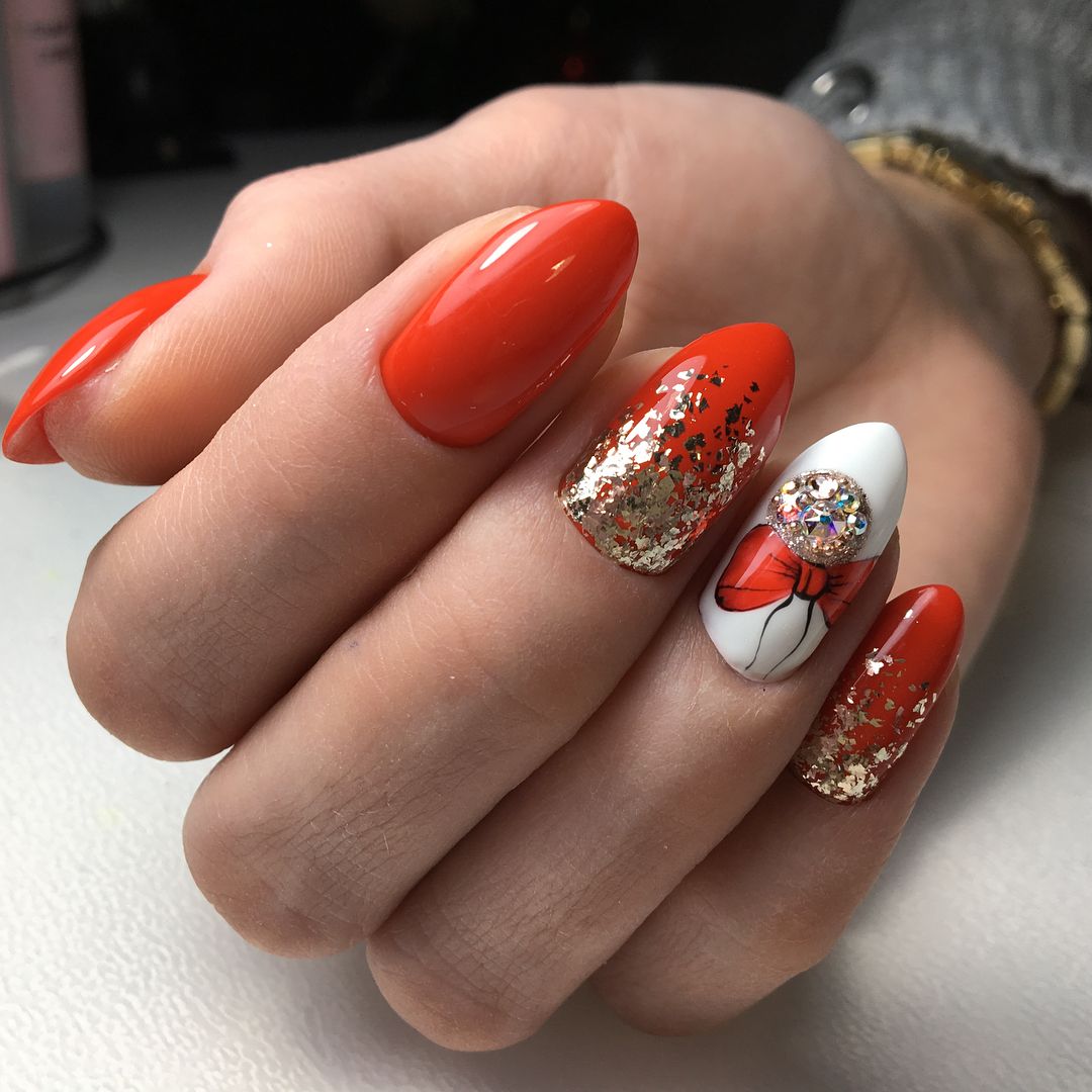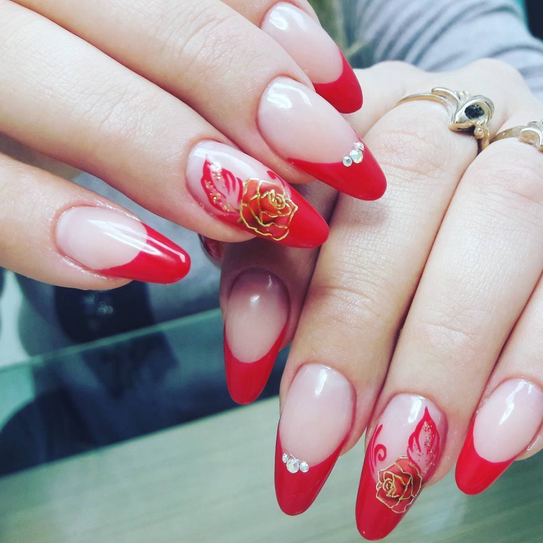 Красные миндалевидные ногти – это сочетание элегантности и женственности. Такой тандем без сомнений можно назвать классическим. На данную форму подходит любой оттенок огненного. В теплое время года желательно использовать гель-лаки светлой гаммы, а в холодное — потемнее. Подборка дизайна и декоративных украшений всецело зависит от образа, которого вы придерживаетесь.