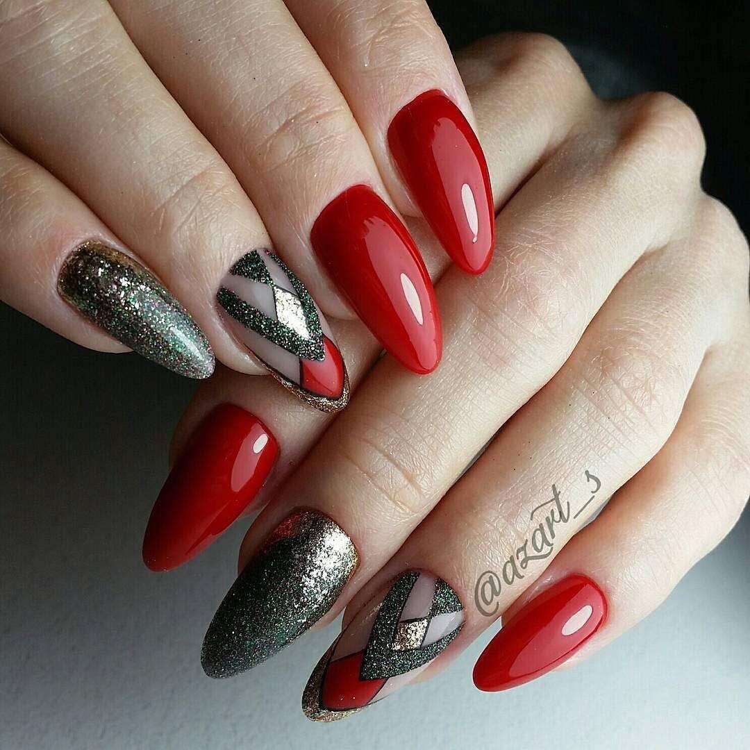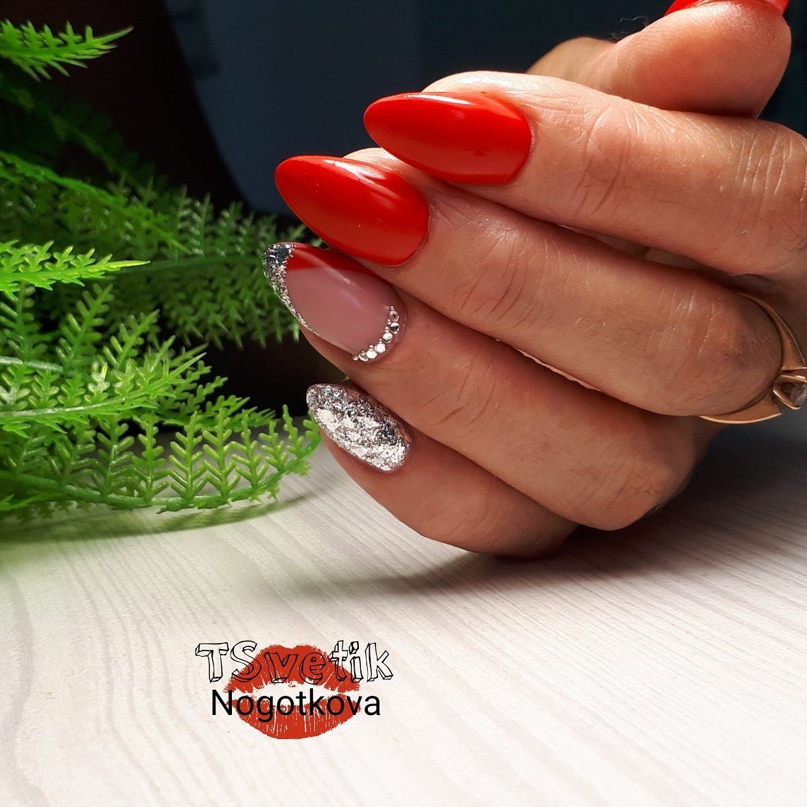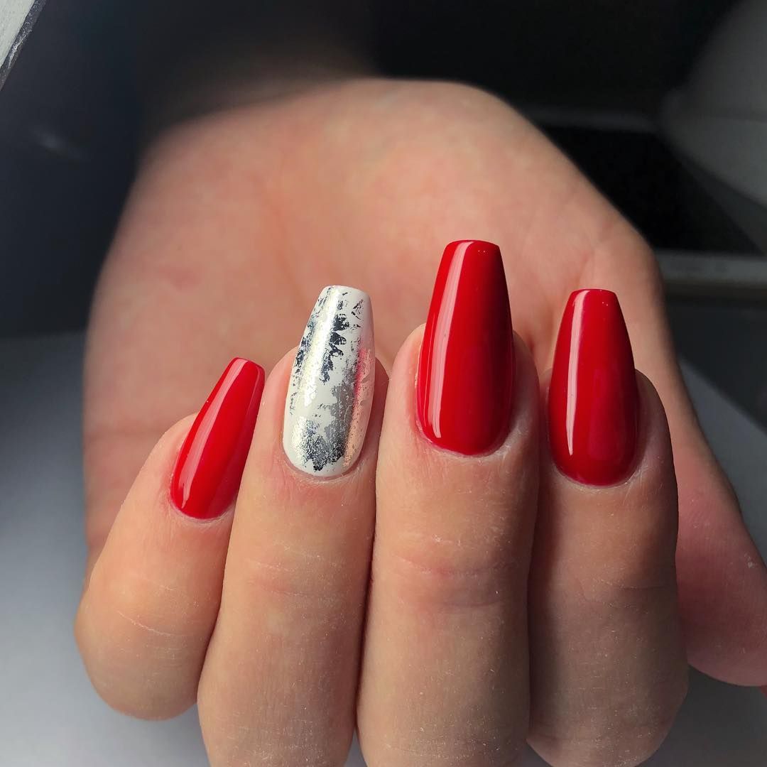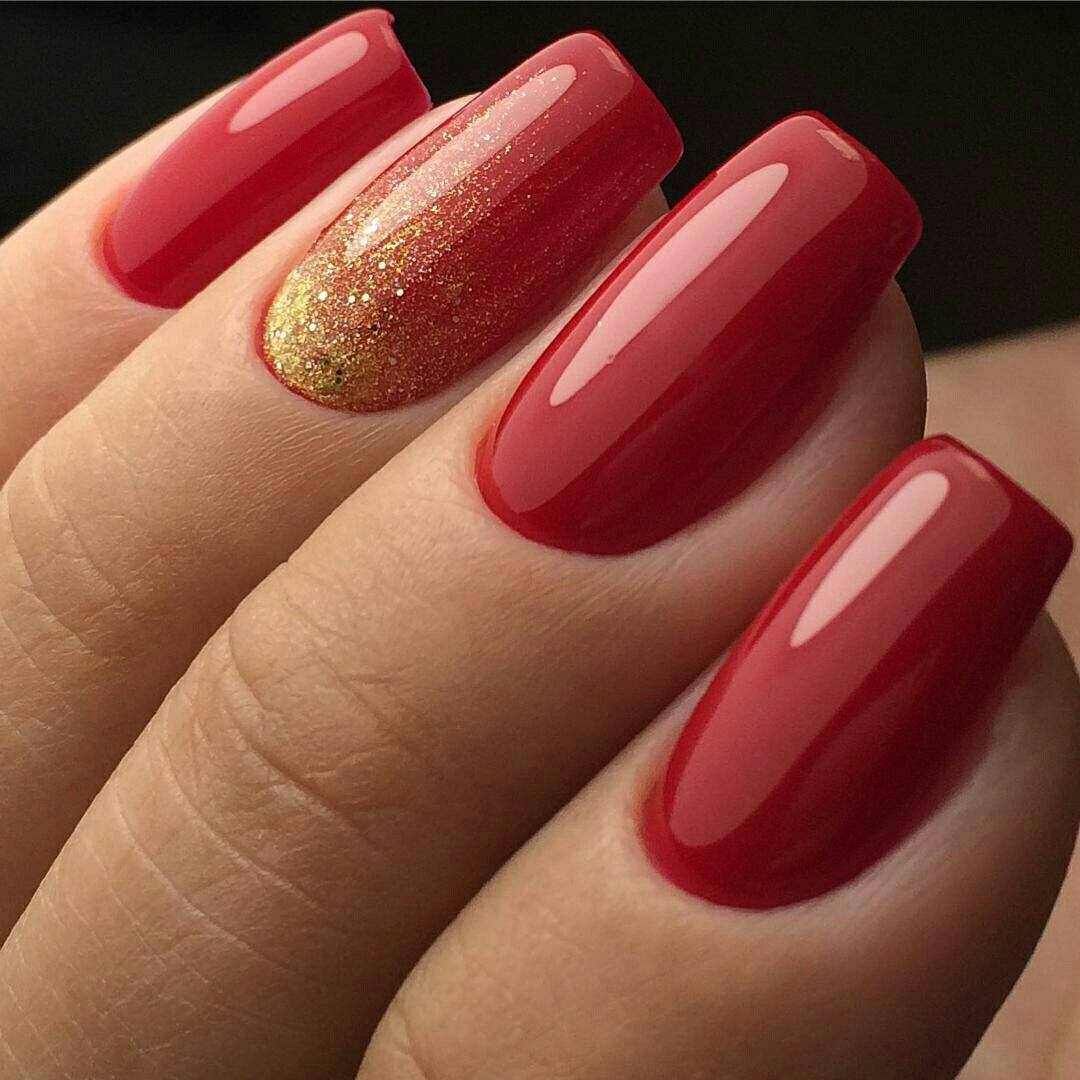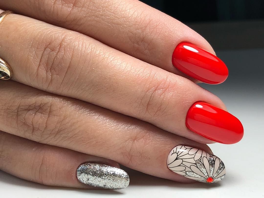 Можно также совмещать красное покрытие с золотом или глиттером. Отлично смотрится алый маникюр с серебром на одном пальце.