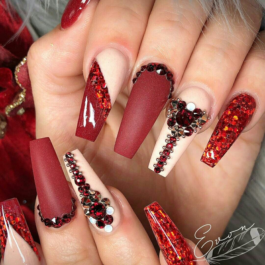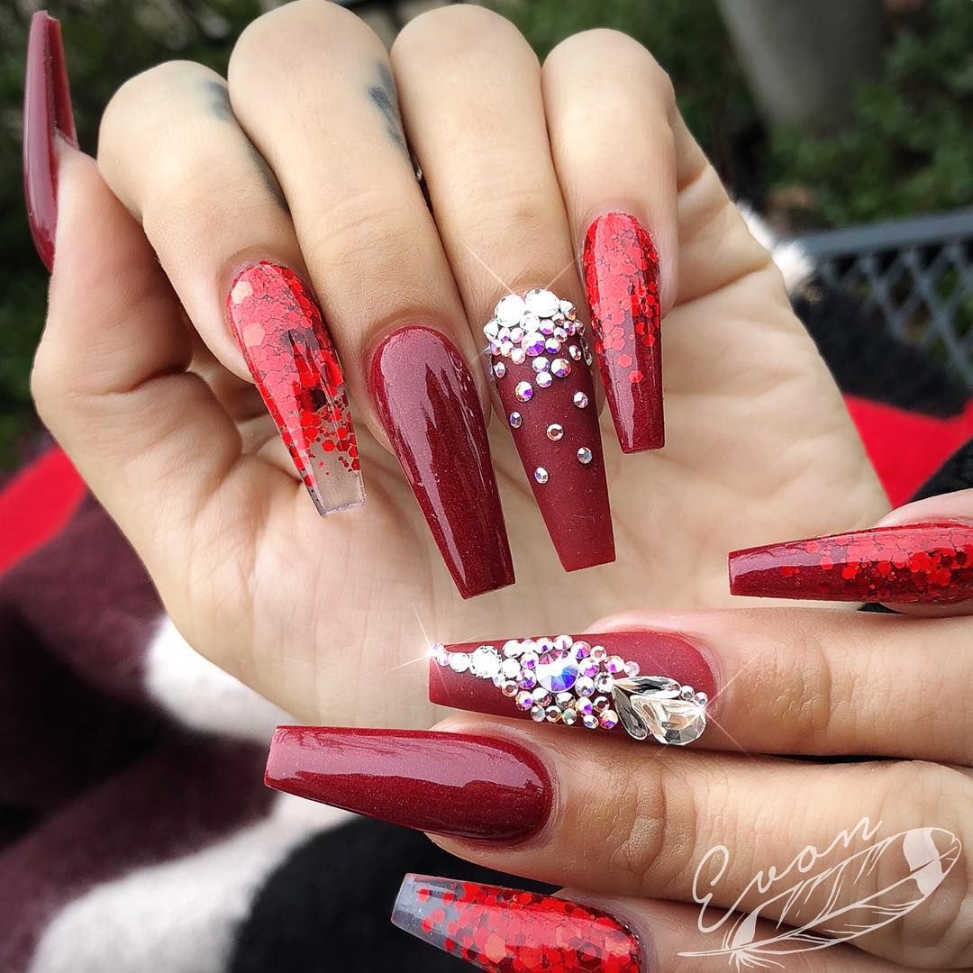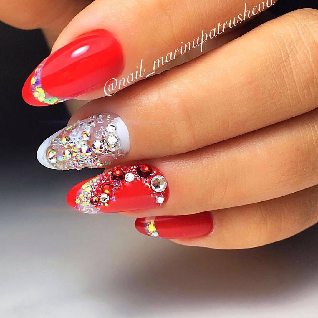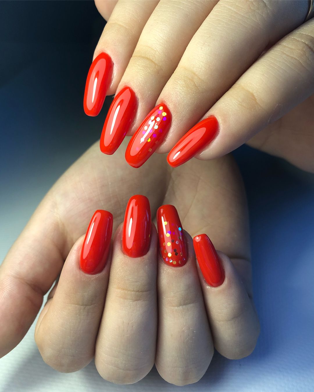 Многие стилисты используют для торжественных или особых случаев всевозможные идеи красного маникюра со стразами и блёстками, ведь если гармонично расположить на ноготках эти дополнения, результат получается просто потрясающий. Украсьте один-два ноготка несложным узором из страз в прикорневой зоне, а на соседних пальчиках создайте глиттерную растяжку. Не менее впечатляет сочетание блеска камней и конфетти. Жидким глиттером можно нанести на красную основу узоры и также дополнить их стразами. Вариаций множество. И да, все эти примеры в конечном результате подтверждают, что блеска много не бывает.