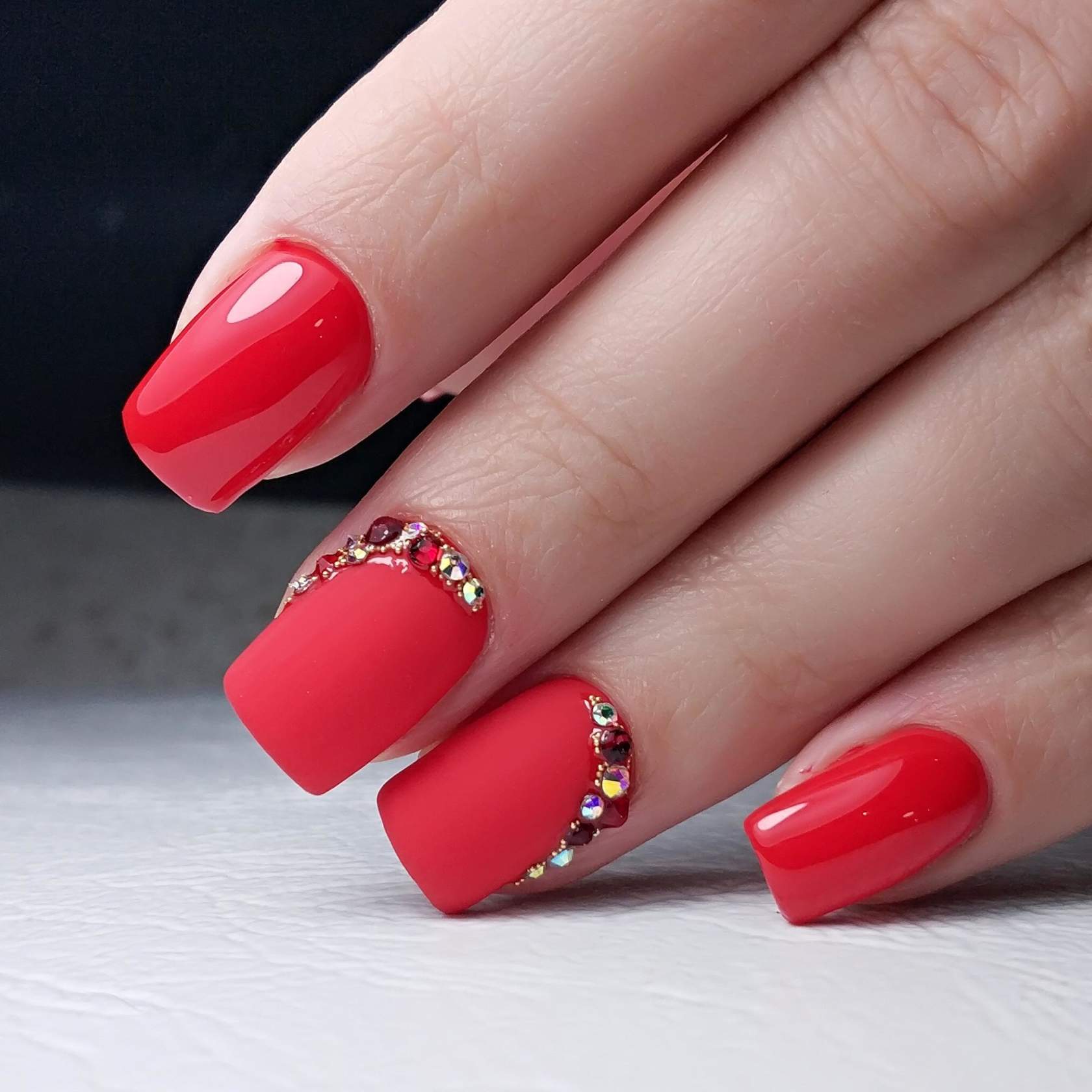 Красный маникюр — отличное и универсальное решение для любого случая. Этот цвет ярок, притягателен и благороден, из сезона в сезон он не теряет актуальности. В зависимости от ситуации, оформить ногти таким лаком можно монохромно или же с добавлением других оттенков, декоративных элементов. На пике популярности всё также остаётся использование матового покрытия в сочетании с глянцевым, геометрические мотивы, омбре.