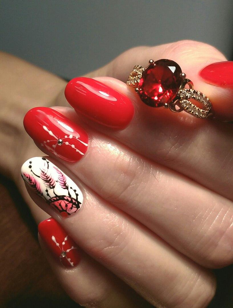 Весной можно разнообразить красный маникюр акцентом в виде белоснежного фона на одном из ногтей и контрастирующей с ним веточкой с красными бутончиками.