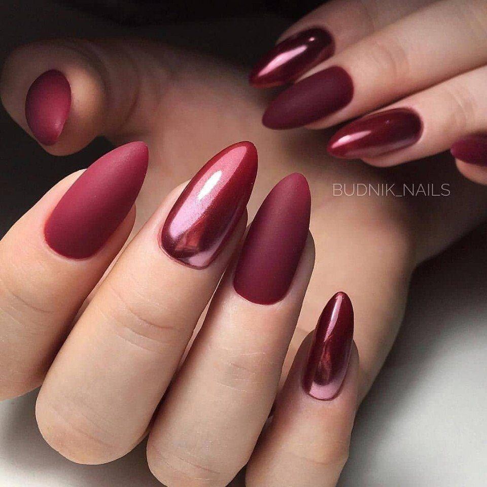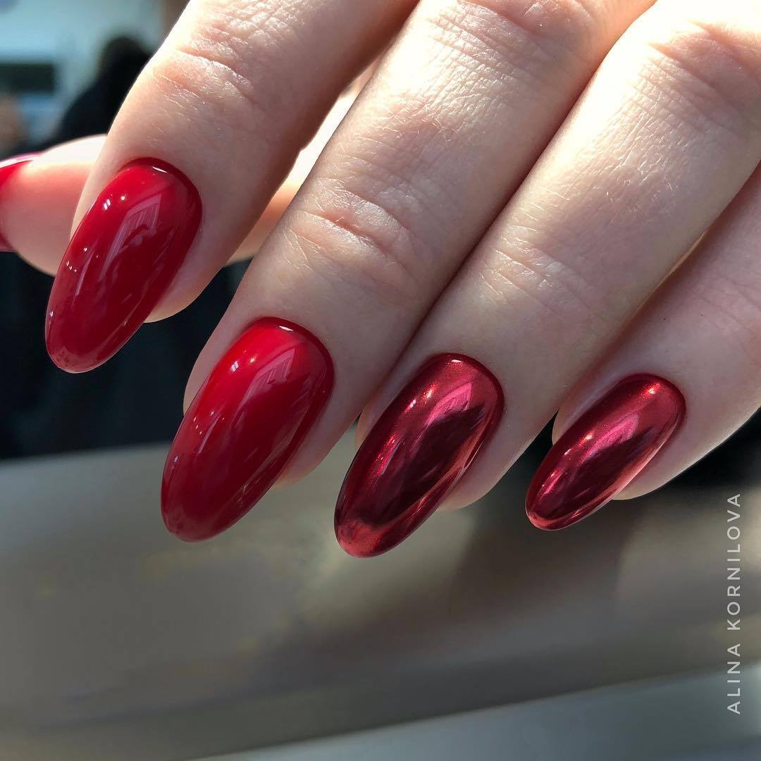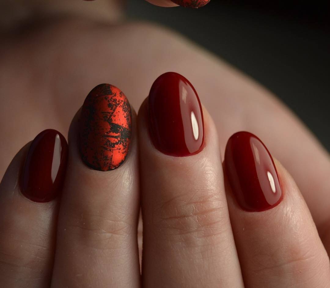 Если вы предпочитаете носить короткие ногти, то красноватая палитра — прекрасное решение выделиться. Лучше использовать бордо или винный оттенок. Они изумительно смотрятся в глянцевом, матовом или металлическом исполнении, что актуально в этом году. Простой металлик можно получить при помощи фольги, зеркальной втирки или сияющего гель-лака.