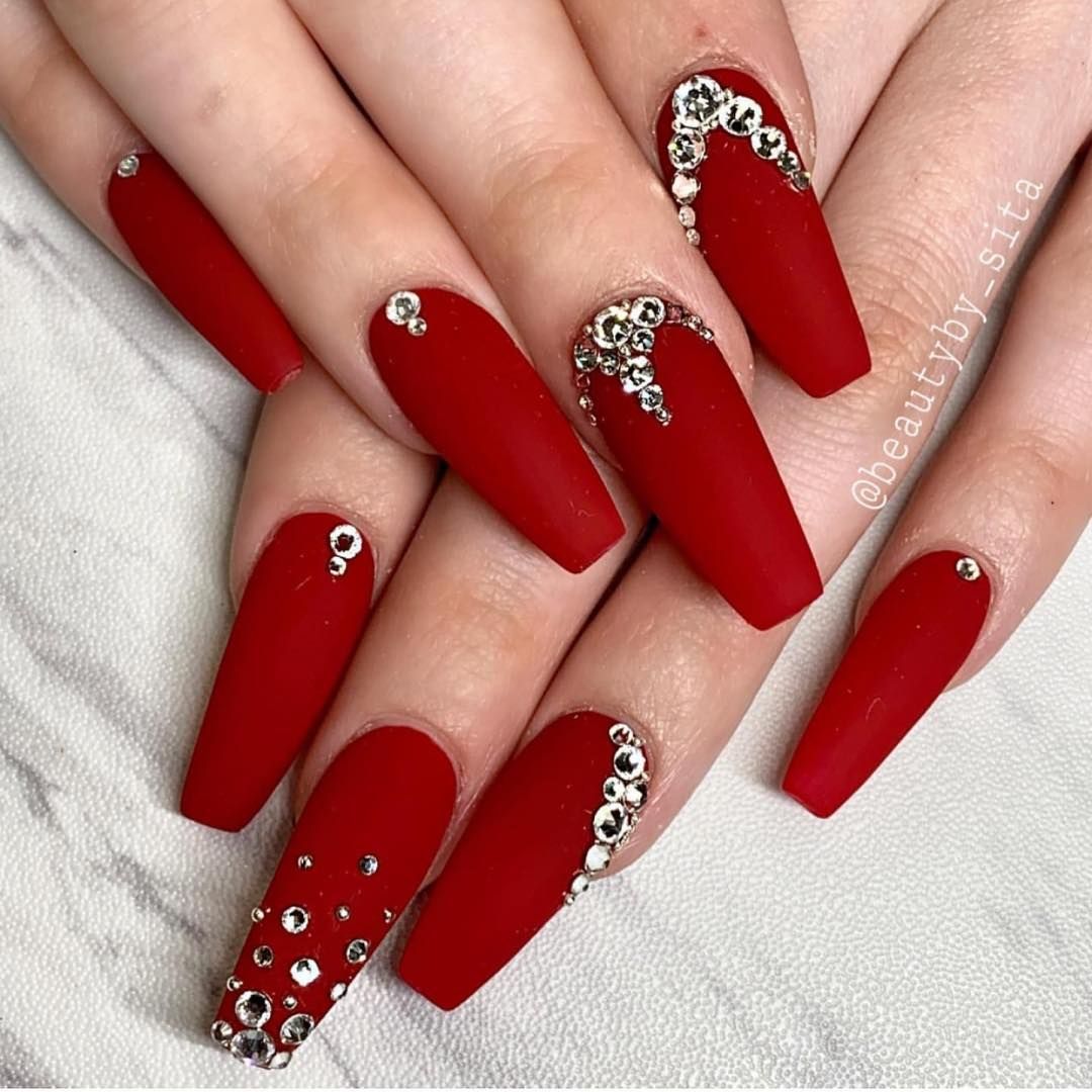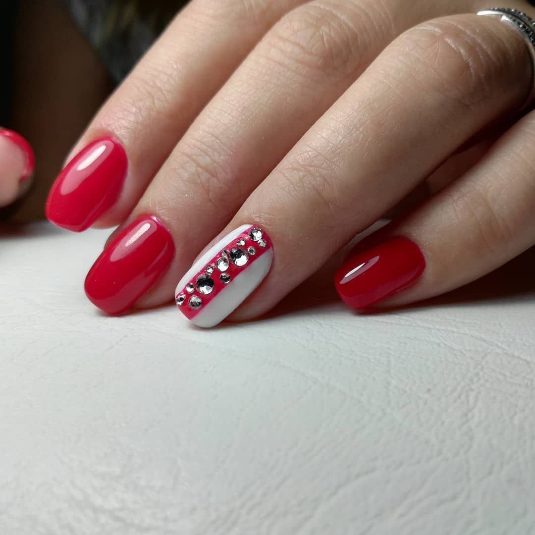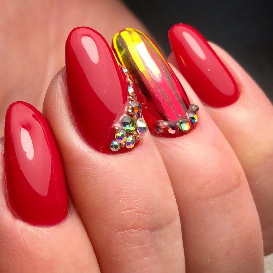 - стразы, камни, бульонки – однотонный красный маникюр в сочетании со стразами выглядит мега-стильно и благородно. Именно такой дизайн ногтей считается универсальным.