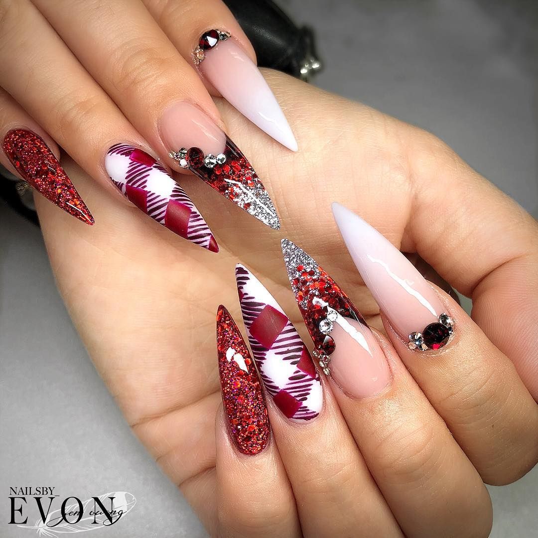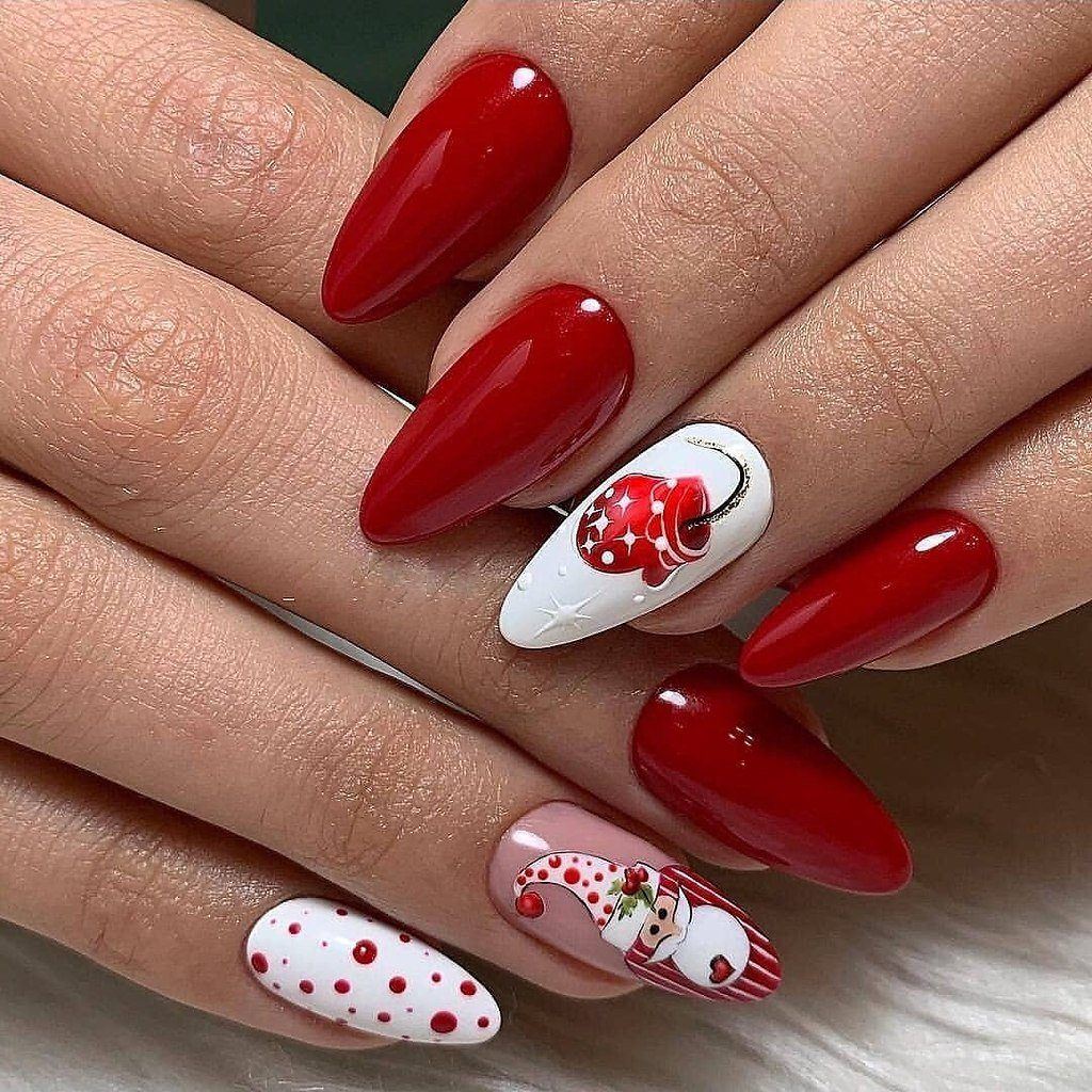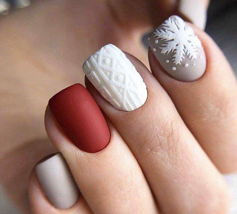 Зимой шикарно будет смотреться маникюр на фото ниже, сложный по выполнению и сочетающий в себе несколько техник. Основные пластинки покрыты глянцевым алым лаком, декор остальных различен.