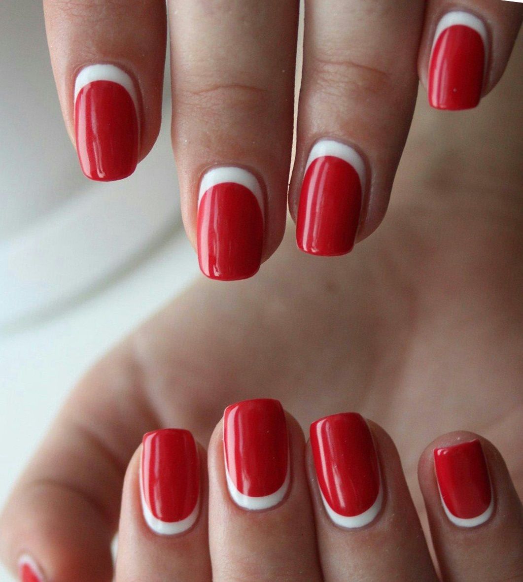 Для красно-белого френча используйте яркие оттенки, которые будут еще выразительнее выглядеть на белом фоне. Как будут располагаться области красного и белого зависит только от вашей фантазии. Закрасьте красным всю поверхность ногтевой пластины и выделите белым гель-лаком «улыбку». Белый френч с красным краем выглядит невероятно женственно и нежно. При этом ширина «улыбки» не должна превышать 5 миллиметров.