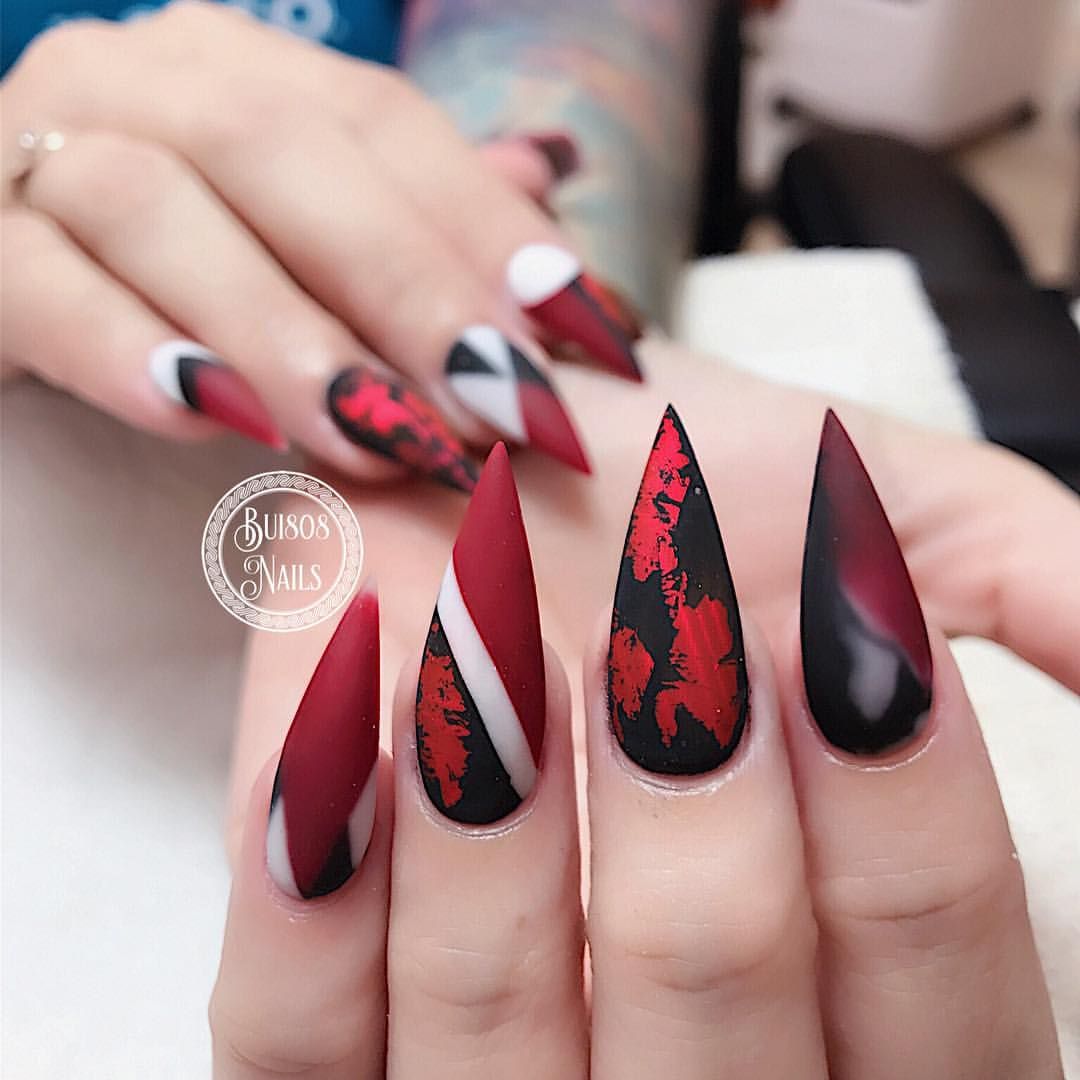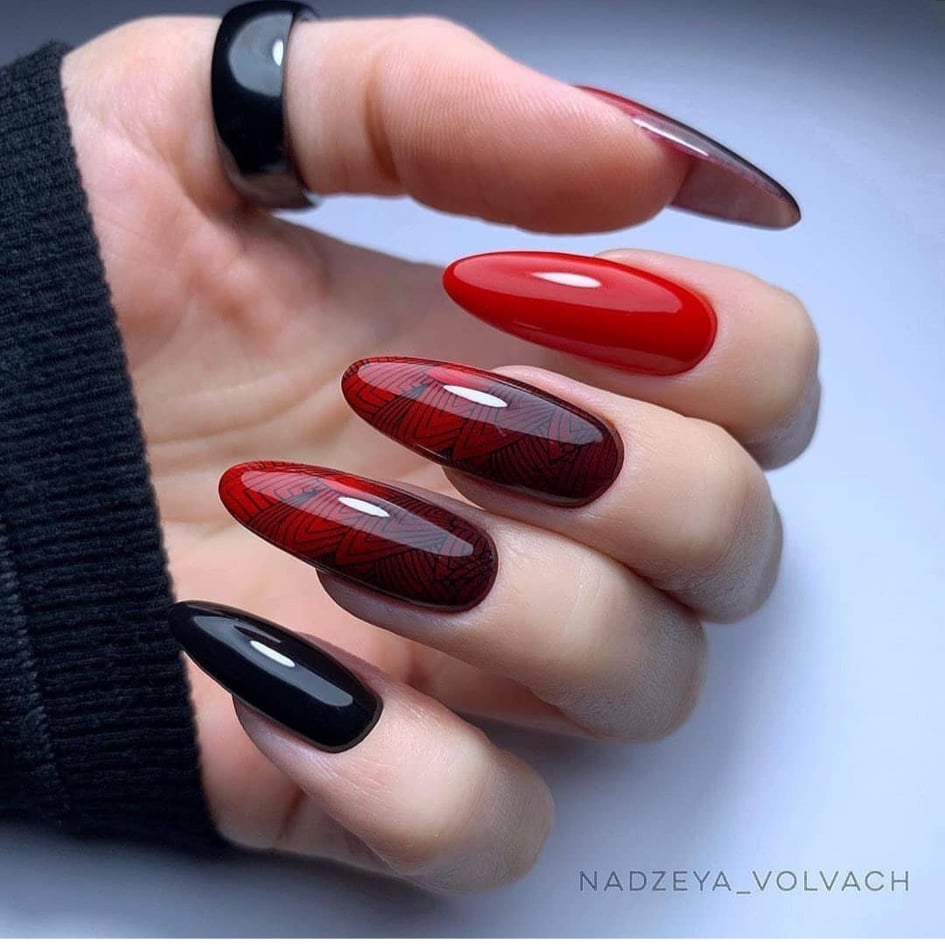 Среди мастеров нейл-дизайна сочетание красного и черного цвета в маникюре считается одним из идеальных, который подойдет женщинам и девушкам любого возраста. Скомбинировать маникюр в красно-черном цвете можно двумя способами. Первый — это графическая разметка ногтя, то есть поверх красного лака наклеивается трафарет с различными узорами и ноготь покрывают лаком черного цвета. После удаления трафарета, на ногтях образовываются различные узоры и рисунки.