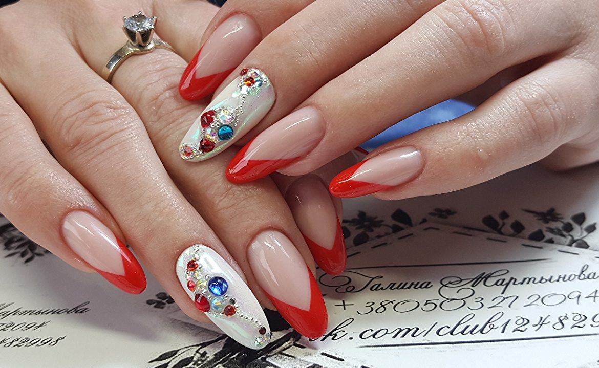 - Красный френч по линии отросшего ногтя, украсив лунку синими стразами.