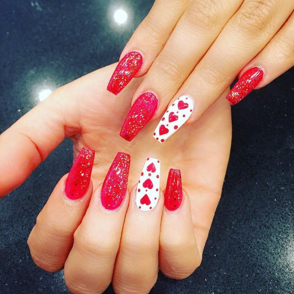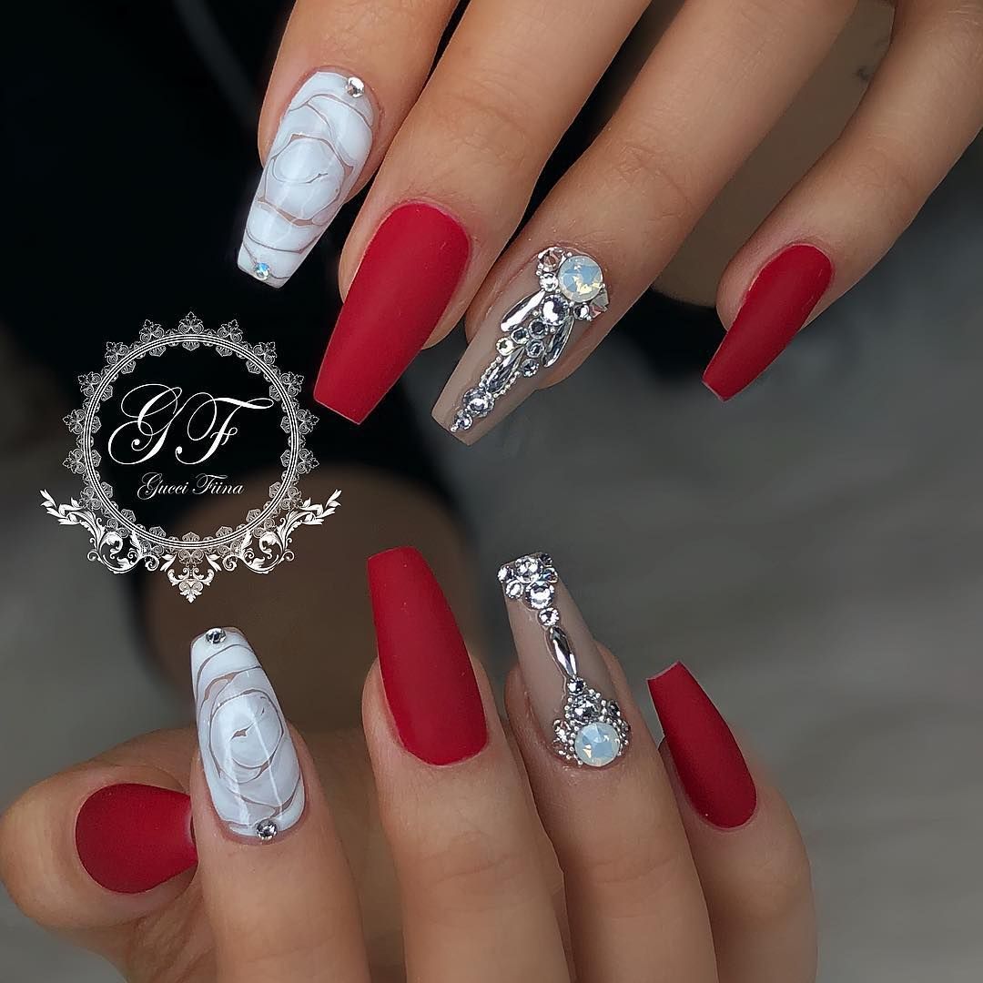 Ещё несколько вариантов красно-белого оформления – романтическое с сердечками и капельками страз, с чёрной геометрической композицией на белоснежном фоне, роскошными россыпями страз, лаконичным лунным маникюром и перевёрнутым френчем.