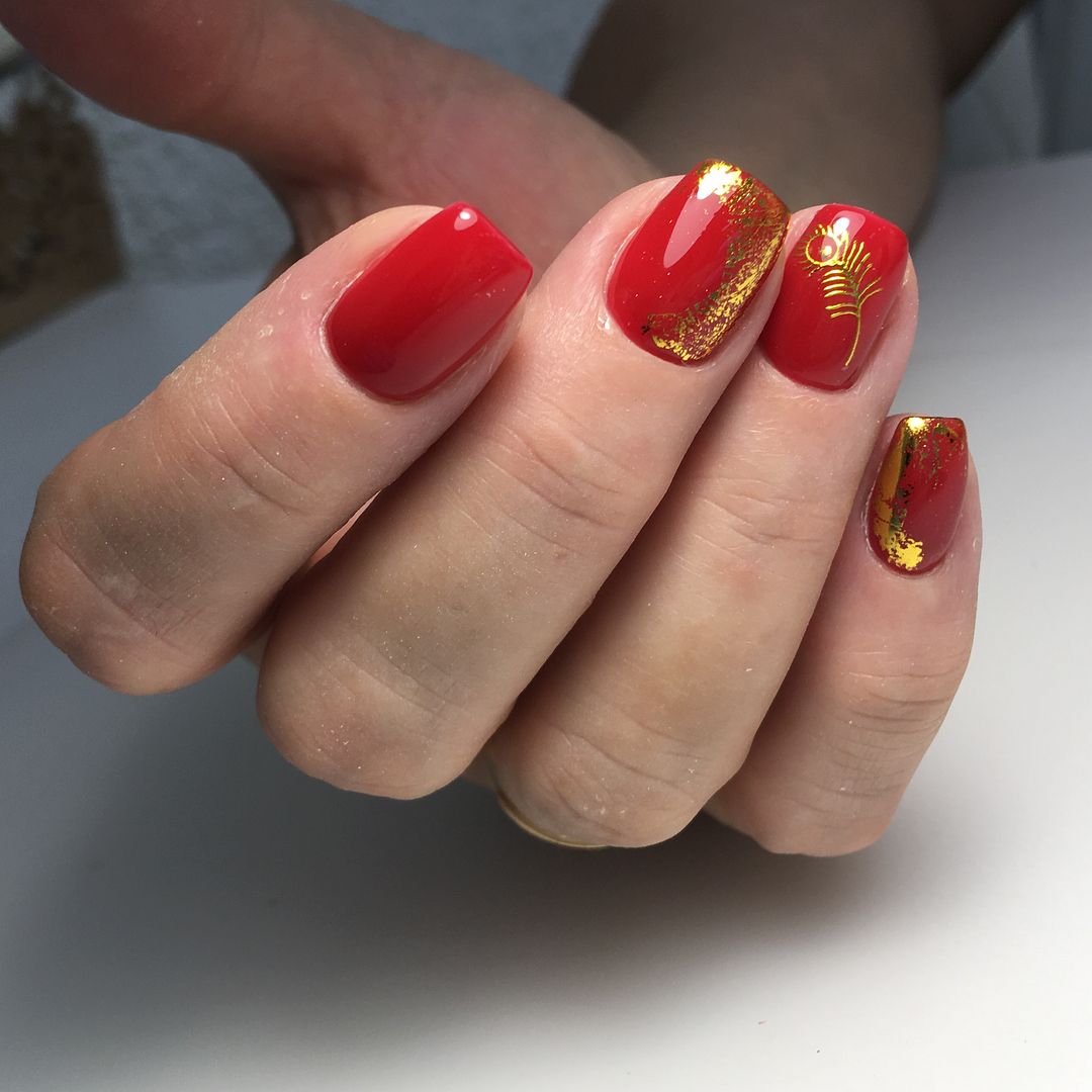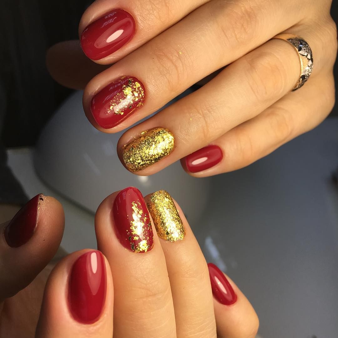 Красно-золотой маникюр довольно сильно привлекает к себе внимание, а потому его стоит сочетать с нарядом или какими-то аксессуарами, в противном же случае он будет смотреться неуместно и вычурно.