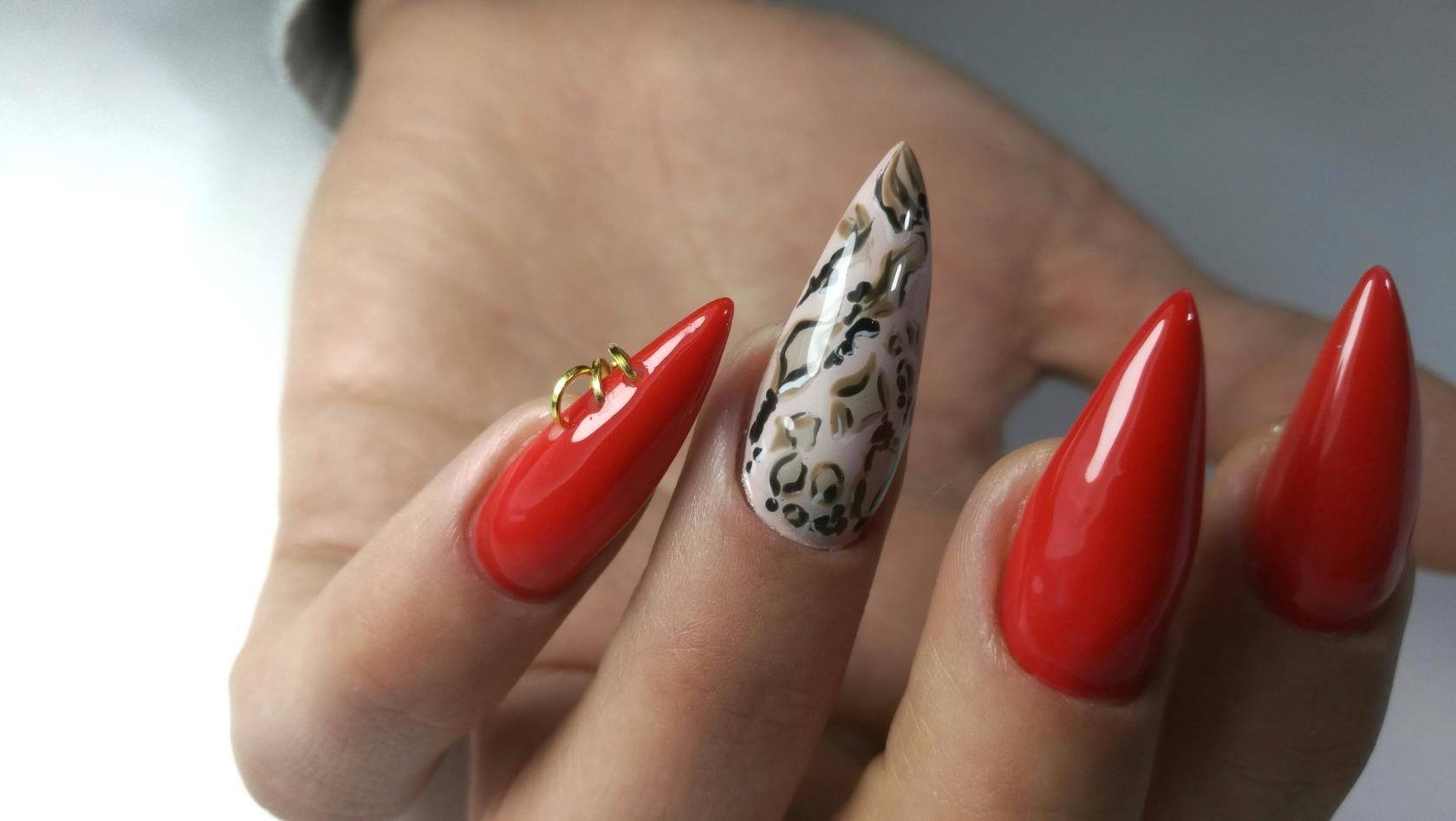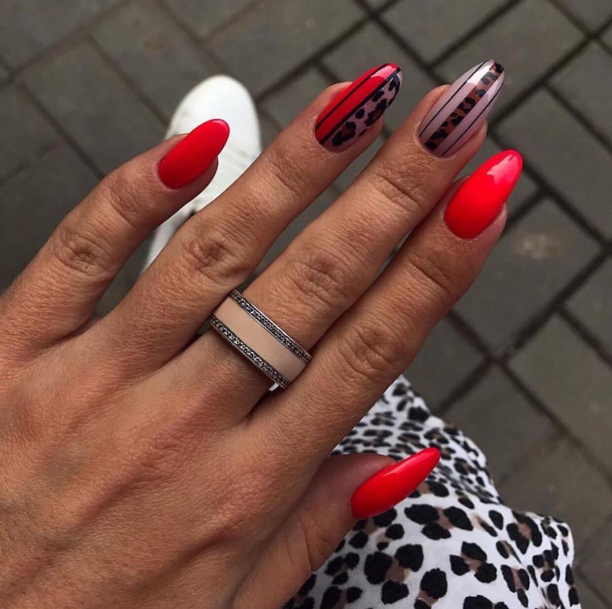 Не выходят из моды и анималистические тенденции: леопардовый принт отлично гармонирует с красным цветом. В качестве декора выступают блестящее покрытие на отдельных ноготках, а также стразы.