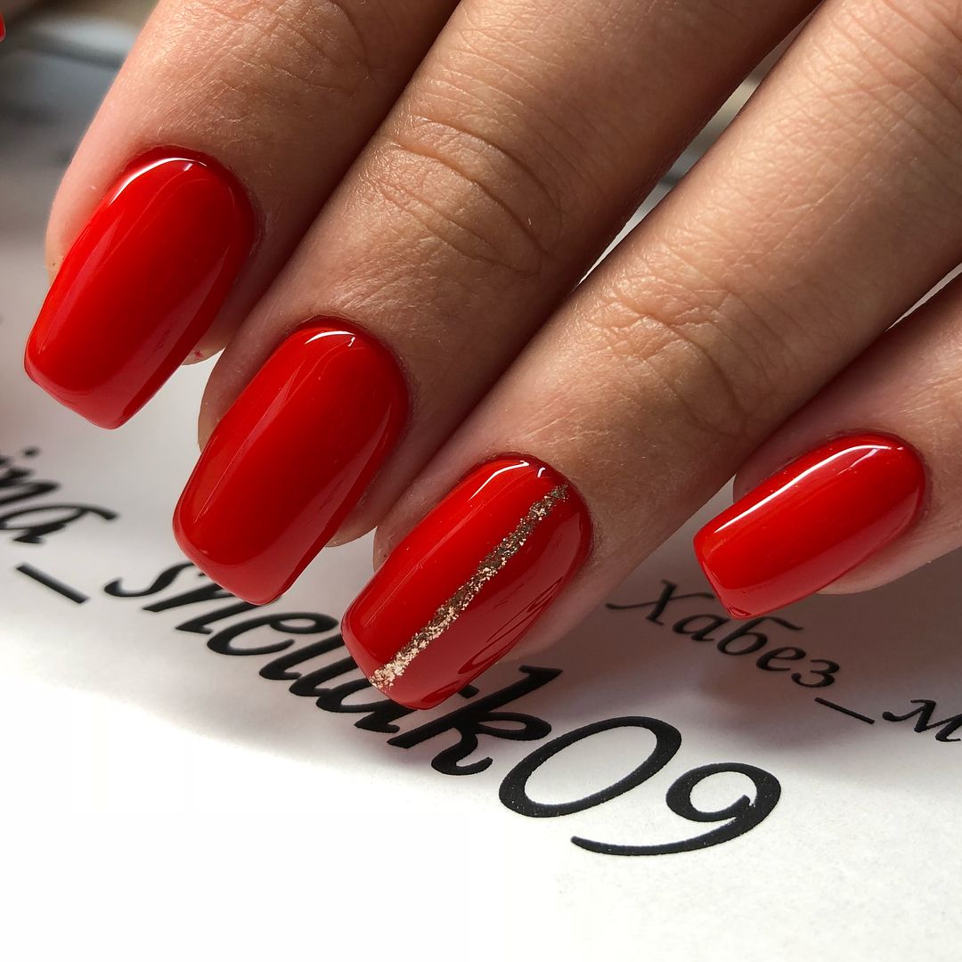 Для повседневных выходов отлично подойдёт классический глянцевый маникюр, выполненный в красном цвете. Он прекрасно впишется в любой образ: будь то строгий офисный костюм или маленькое чёрное платье.