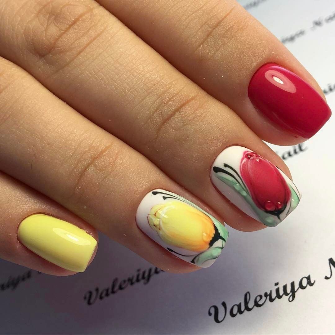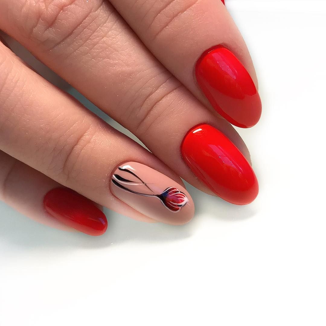 В красном цвете можно выполнить мелкие полевые цветы, бутоны и листочки. Шикарно выглядит маникюр с орхидеей в бордовом или вишневом цвете. В весеннем маникюре великолепно смотрятся тюльпаны в розовом, красном, оранжевом цветах.