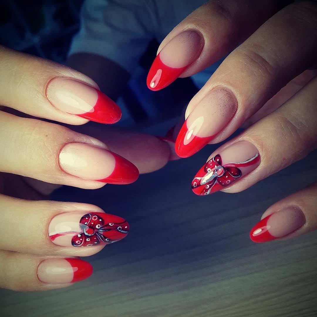 Сочетание техники классического френча и лунного маникюра в красно-белой гамме: