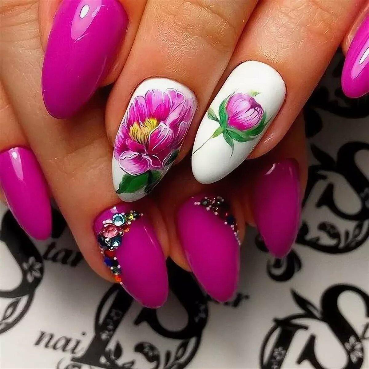 Пионы чаще всего изображают в розовом цвете. Именно этот оттенок имеют пионы от природы. Но не исключены и интересные варианты, например, в алом, фиолетовом, сиреневом цветах. Пионы достаточно сложно изобразить на ногтях, так как цветок имеет множество лепестков, которые необходимо гармонично соединить между собой. Поэтому для выполнения маникюра с пионами рекомендуется использовать слайдеры, лучше на прозрачной основе.