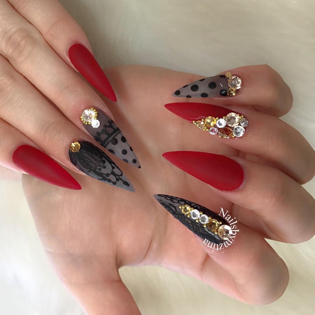 Красно-черный маникюр отлично выглядит в матовом исполнении, ну или с акриловой пудрой, правда, с ним приходиться вести себя более аккуратно, чем с глянцевым решением.