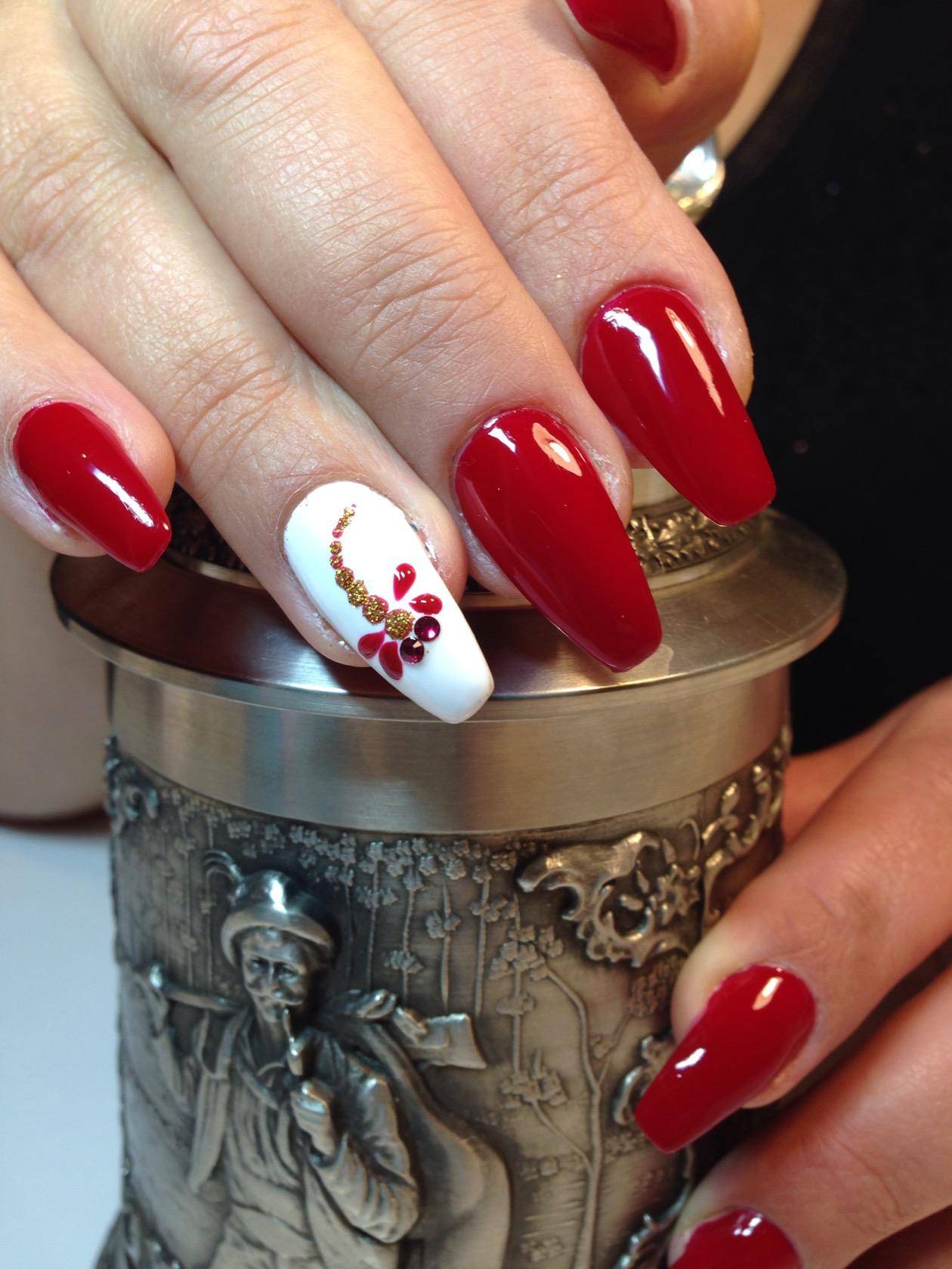 Лаконично и выразительно смотрятся ногти, покрытие красным лаком, с небольшими акцентами в виде страз у лунок.