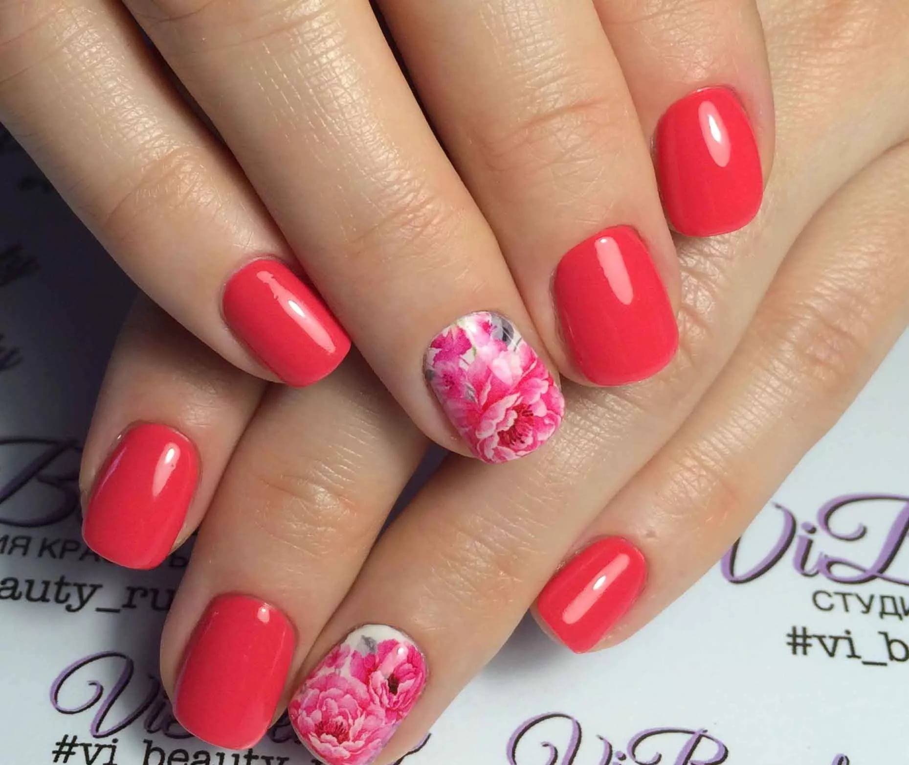 Визуально пионы выглядят достаточно сложно за счет большого количества лепестков, поэтому располагать их лучше на 1-2 ноготках. Остальные ногти можно украсить красным или белым гель-лаком.