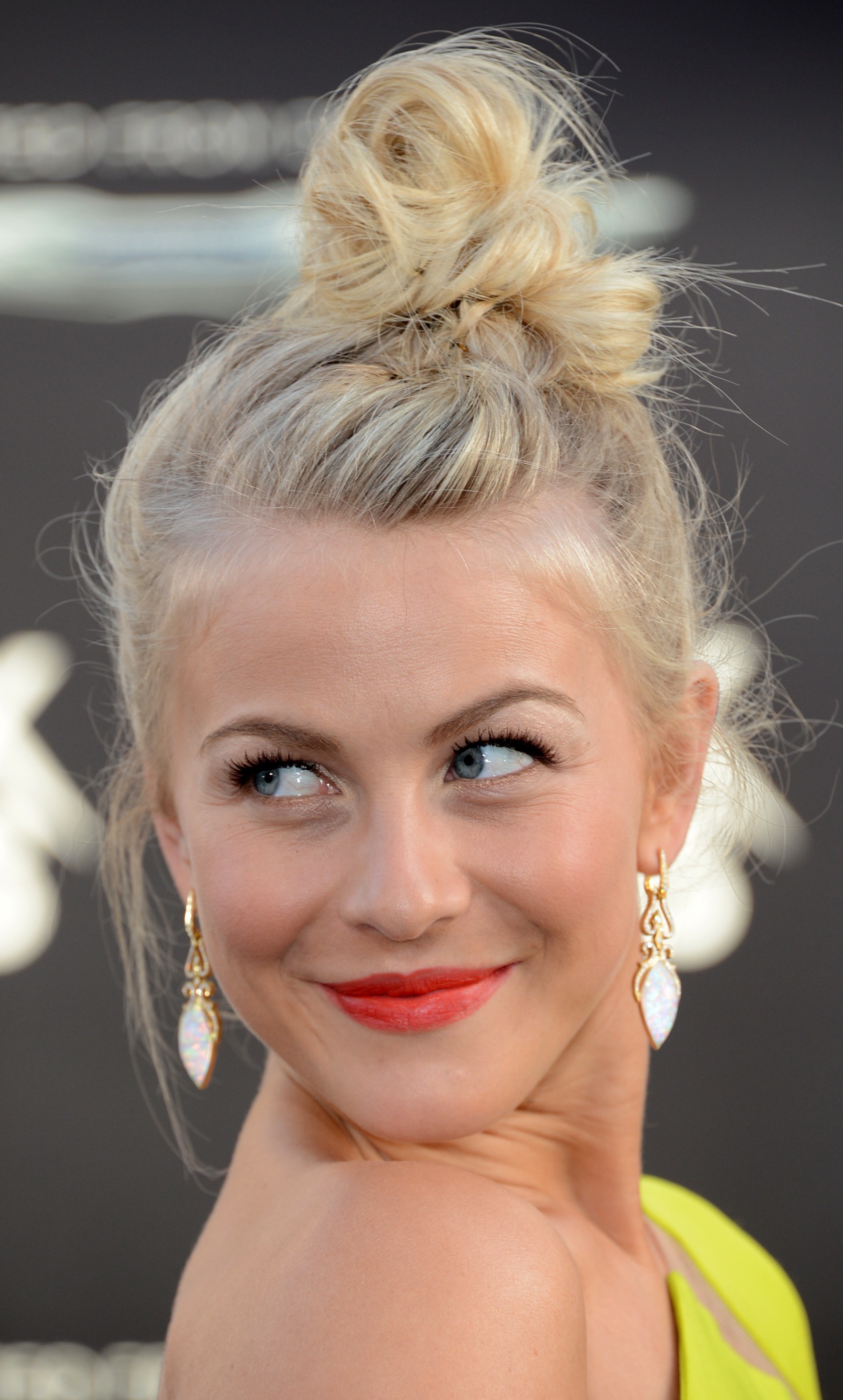 Модной прической на среднюю длину волос является «Хан». В этом случае распущенные пряди сочетаются с пучком, сделанным из верхней части локонов. Пучок может быть один или два.