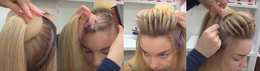 - Кончики волос обмотать вокруг ободка и скрутить их по направлению вверх к середине головы.