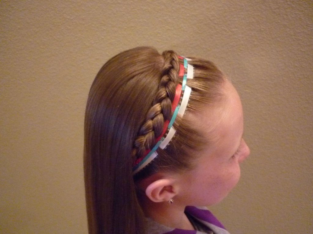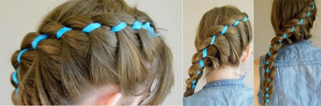 - После этого воспользоваться второй лентой, которую нужно продеть в волосах в шахматном порядке.