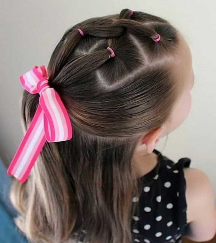 На каждый день не будет хватать времени, а вот на 1 сентября можно уделить на 10-15 минут больше на укладку при помощи зажимов-«крабиков». Для этого отдельные пряди складываются в сердечко и закрепляются заколками. Разнообразить можно при помощи небольших бантиков, украсив ими «крабики».
