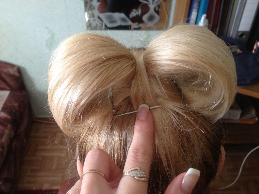 - Маленькой прядкой декорируем серединку банта, кончик волос прячем в прическу.